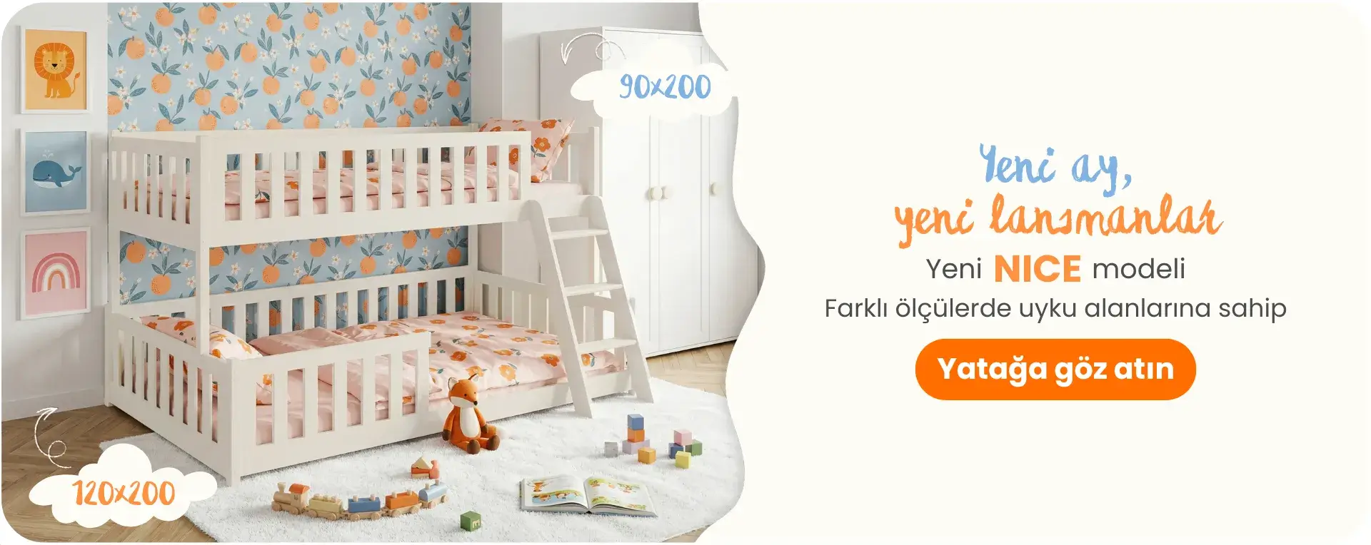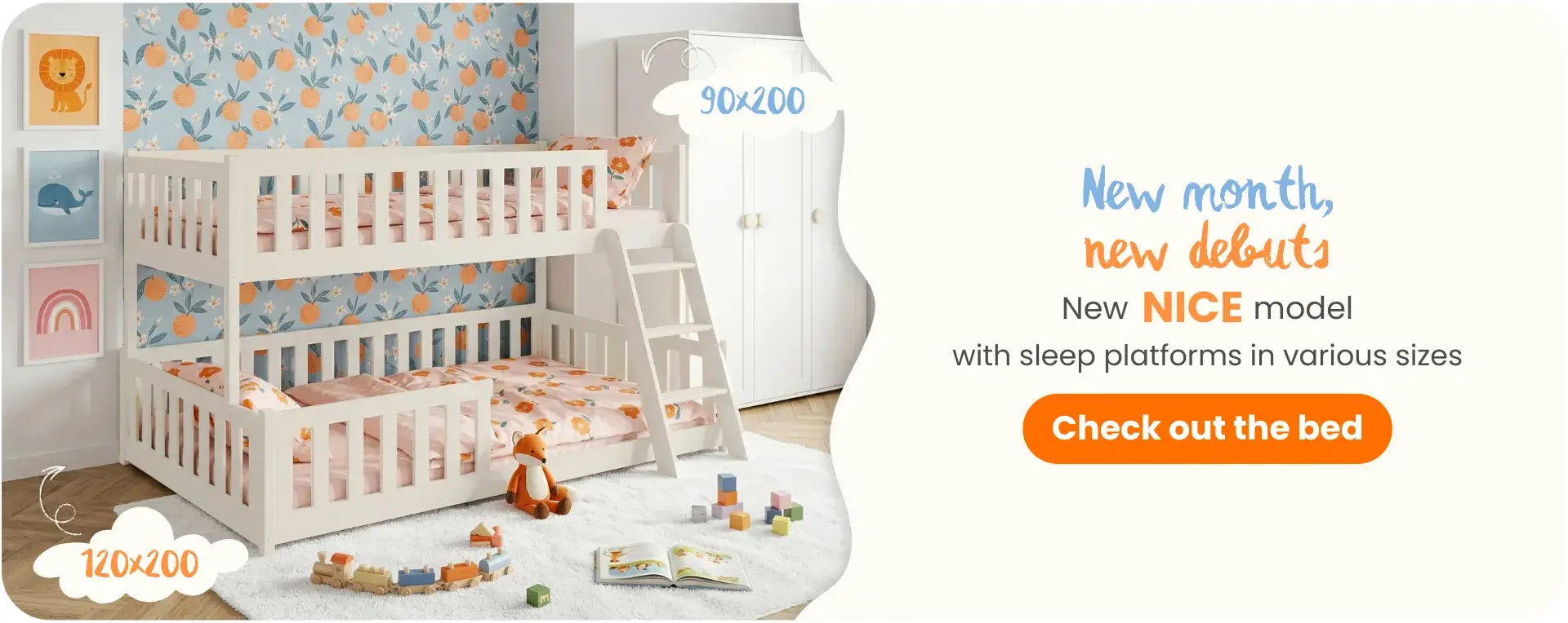 Das Bett NICE mit breitem Unterteil und bequemem Leiteraufstieg zum oberen Deck.