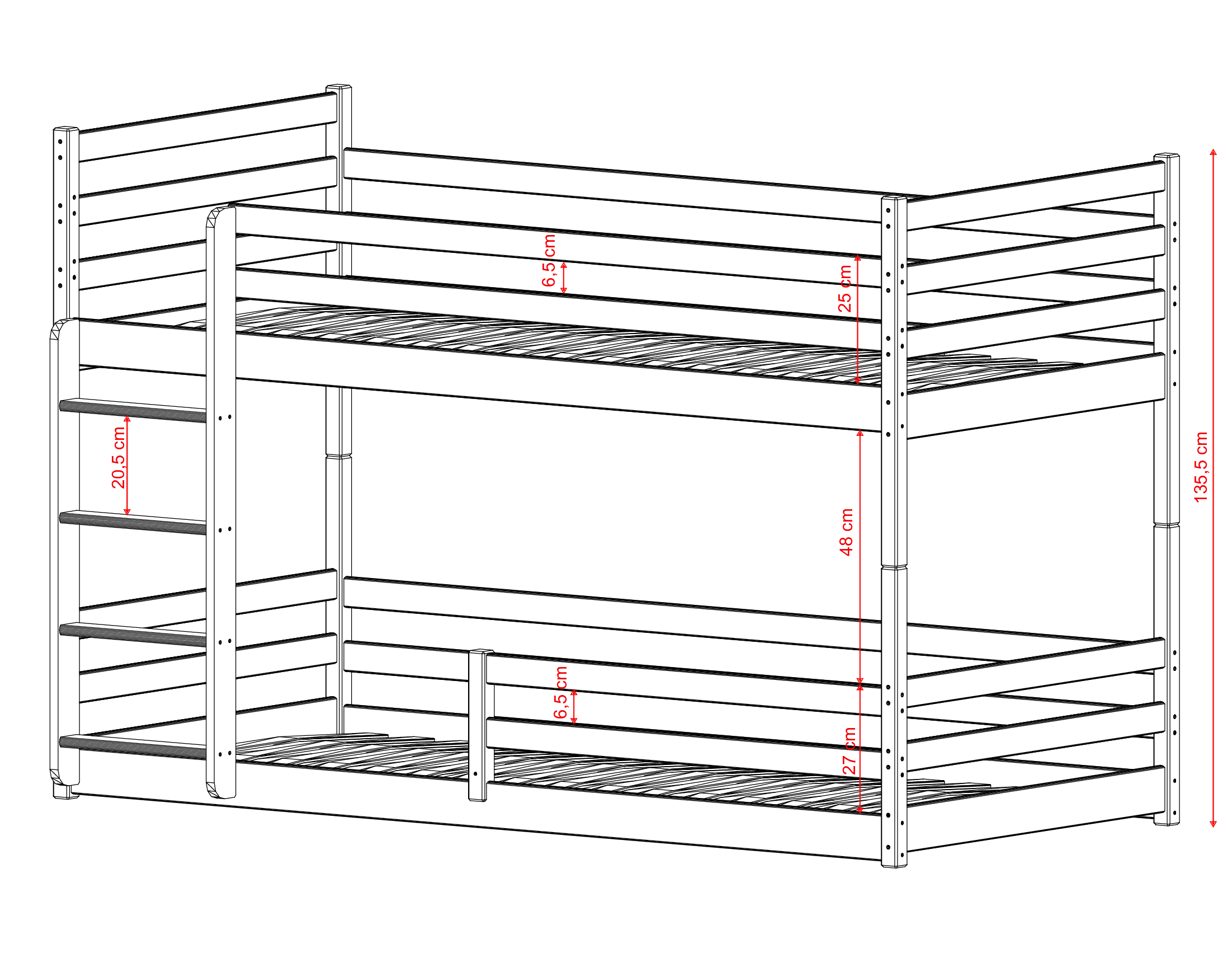 MINI-Etagenbett ist ein Möbelstück, das auf der Grundlage der Erfahrungen und Beobachtungen der jüngsten Kinder entwickelt wurde. Dadurch ist es uns gelungen, eine Lösung zu schaffen, die ist äußerst bequem, sicher , und gleichzeitig passt sein Stil in den Rahmen vieler Arrangements. Es besteht auch die Möglichkeit, seitlich eine Leiter zu montieren, wodurch MINI-Etagenbett ist unabhängig von Größe und Form eine ausgezeichnete Wahl Kinderzimmer . Warten Sie nicht, schließen Sie sich jetzt der Gruppe zufriedener Kunden an Lano Meble . Zwei Kinder Zuhause macht es auf jeden Fall eine große Freude! In einem solchen Fall müssen Sie jedoch immer über funktionale Lösungen nachdenken, die Platz sparen. MINI-Etagenbett es entspricht perfekt diesen Erwartungen! Solche Möbel sind für jedes Kind ein wahrgewordener Traum. Schauen Sie sich an, was Sie sonst noch überraschen wird. Bau MINI-Etagenbett besteht aus aus Kiefernholz , also sehr solides Material . Dies ist eine Lösung, die sicherlich jedem Kind gefallen wird, unabhängig von Alter oder Geschlecht. Die perfekten Proportionen und die aufwendige Verarbeitung des Bettes garantieren einen komfortablen, ruhigen und tiefen Schlaf für zwei Kinder .