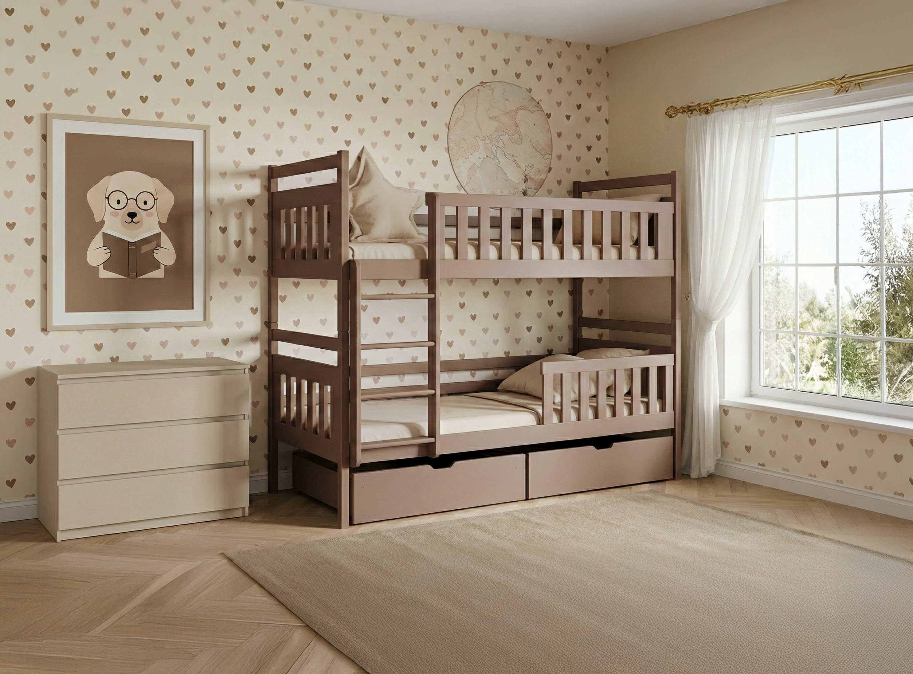 Etagenbett aus Milchschokolade. Die Ideen von Kindern ändern sich mit Lichtgeschwindigkeit. Morgens wünschen sie sich einen Raum voller Dinosaurier, nachmittags einen ganz orange gestrichenen Raum und abends träumen sie von einem Raum voller Einhörner. Sie wissen sicherlich, dass es manchmal schwierig ist, mit diesen Träumen Schritt zu halten, also wählen Sie MONIKA Etagenbett , was hat einfache, minimalistische Form , sodass es jedem passt, auch dem Verrücktesten Kinderzimmer .