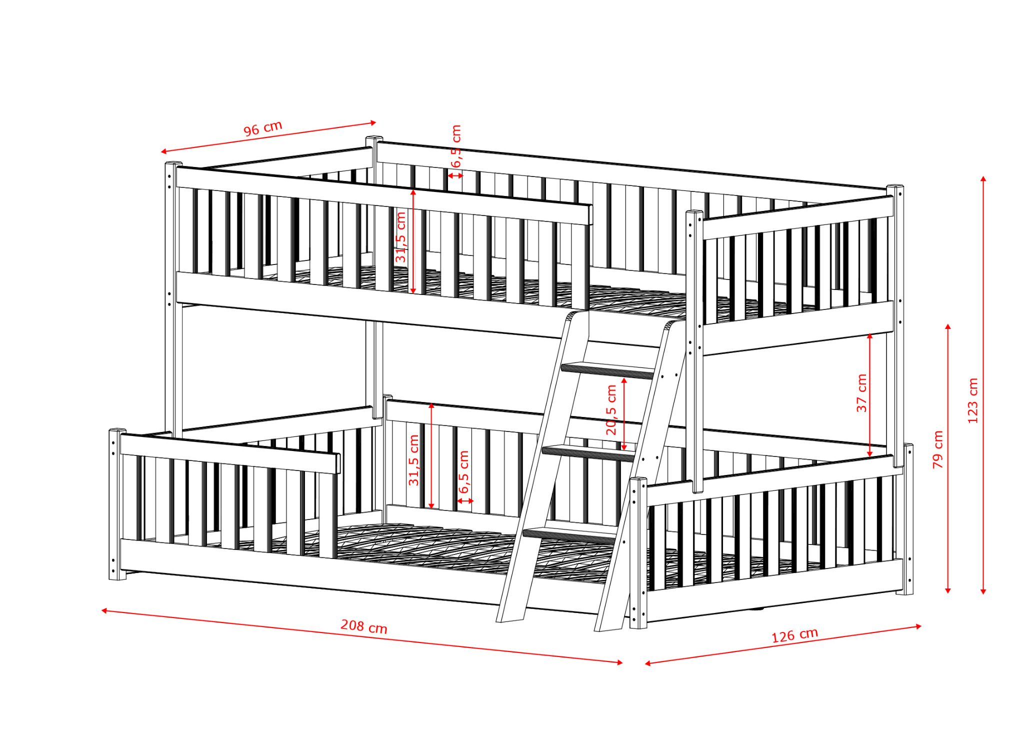 Das Besondere am NICE Etagenbett von Lano Meble ist seine einzigartige Konstruktion und die Matratzengröße. Die obere Matratze misst 90x200 cm, die untere 120x200 cm. Das Bett besticht durch sein schlichtes Design mit vertikalen Gitterstäben, ohne unnötige Verzierungen. Dadurch eignet es sich perfekt für Kinderzimmer und Jugendzimmer. Das tannenfarbene Bett NICE bildet die perfekte Grundlage für jede Bettwäsche, die Sie je nach Stimmung wechseln können. Bei der Gestaltung eines Kinderzimmers lohnt es sich, auf universelle Möbel zu setzen – so können Sie die Einrichtung durch einfaches Austauschen der Accessoires an die aktuellen Interessen Ihrer Kinder anpassen.