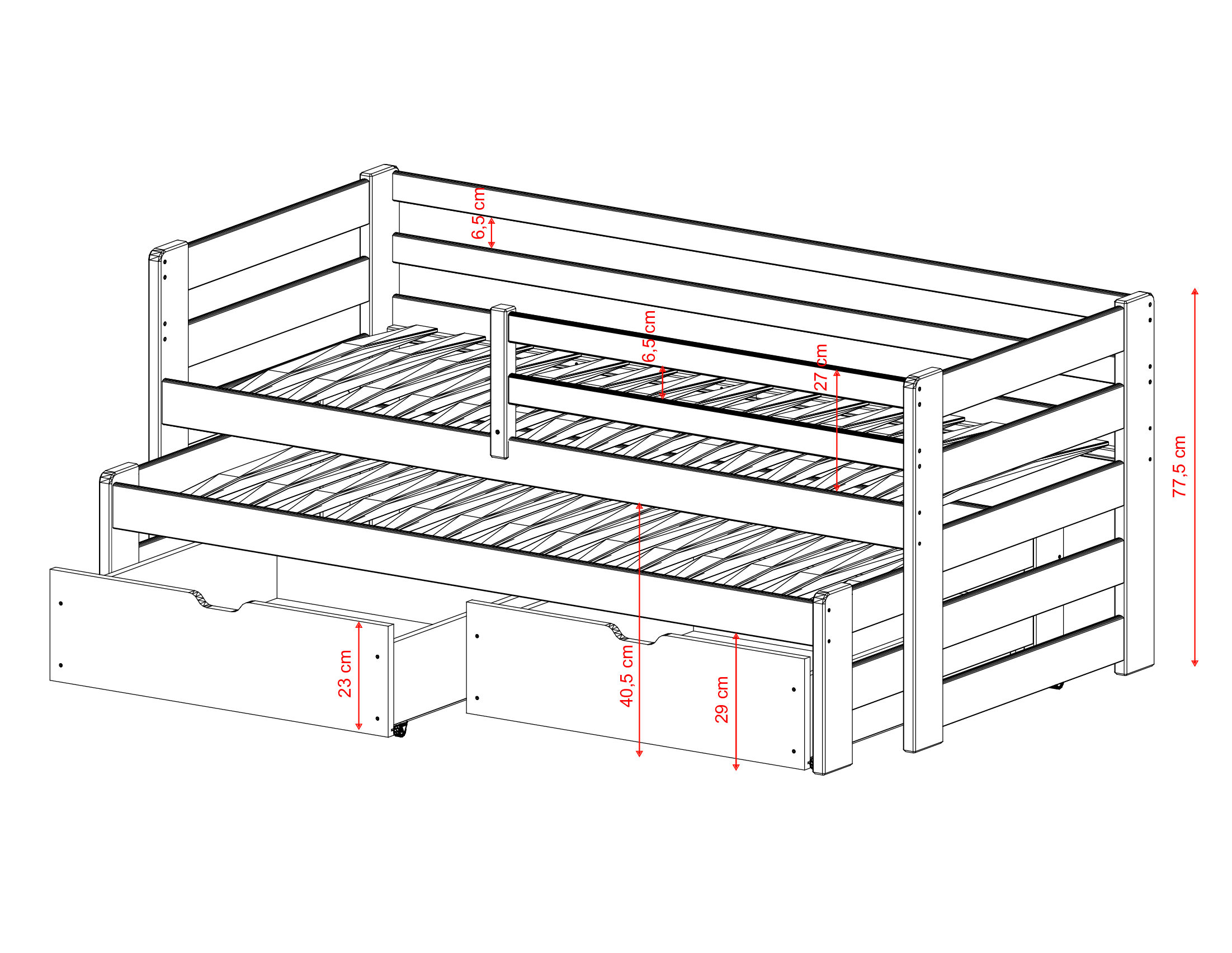 ist aus Kiefernholz gefertigt, was es macht SENSO-Bett langlebig und langlebig. Es handelt sich also um eine langfristige Investition, am Anfang kann es sein Etagenbett für Kinder , und später auch für Jugendliche. Rahmen unter der Matratze gemacht Hergestellt aus einer FLEX-Leiste aus Birke, die das Ganze belastungsbeständig macht. Ausziehbares Etagenbett SENSO ist eine gute Alternative zu zwei Getrennte Betten im Zimmer , wo kein Platz für sie ist. Es nimmt genauso viel Platz ein wie Standard Einpersonenmodelle . Optional kann es mit ausgestattet werden geräumige Schubladen zur Aufbewahrung, z.B. für Bettwäsche, Spielzeug oder Kleidung.