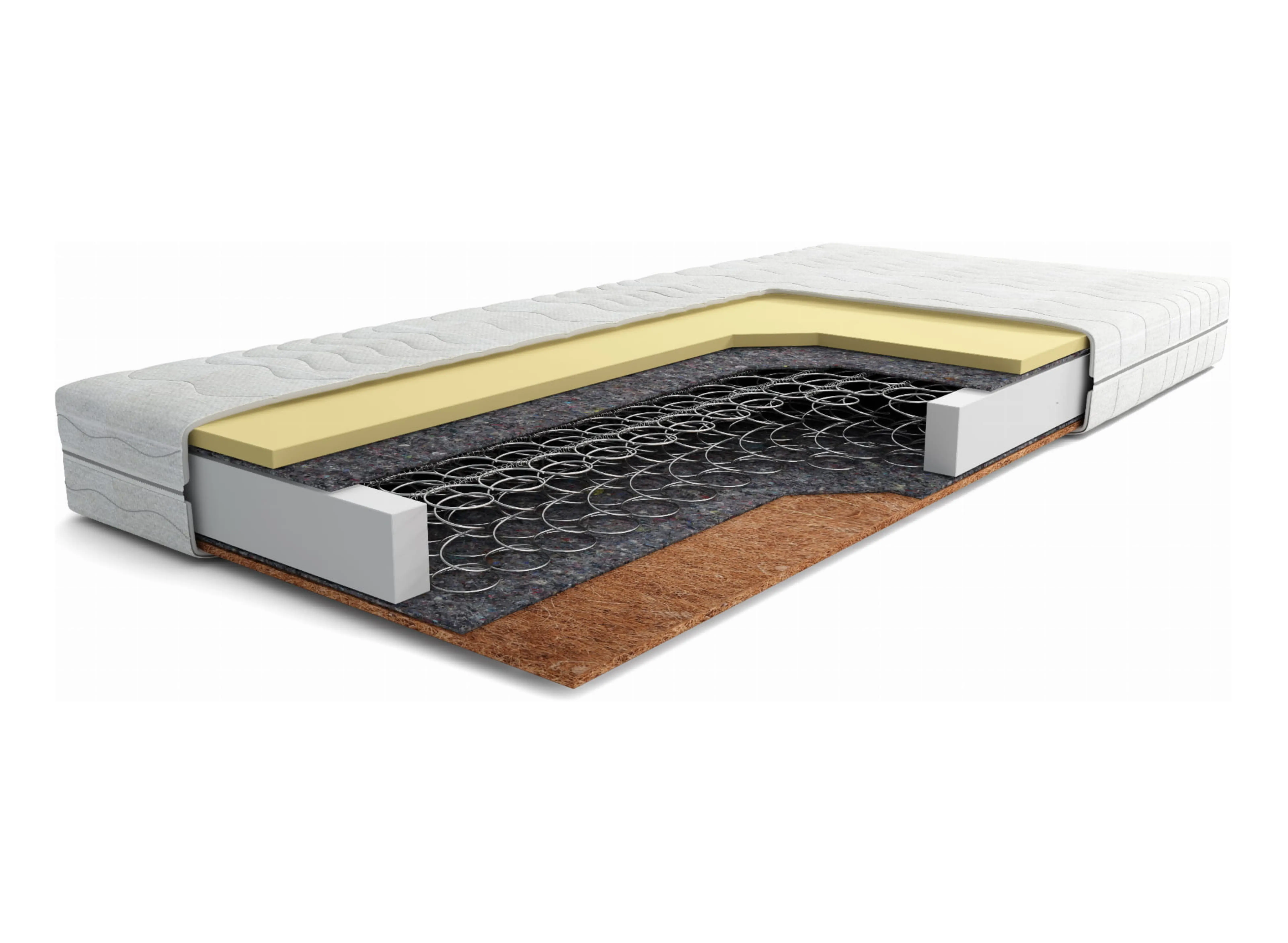 Die Matratze POLLO ist ein Produkt von höchster Qualität, in dem die Bonellfedern innovativ eingesetzt wurden. Solche Lösung hat sich bewährt und wird seit vielen Jahren angewendet. Kennzeichnend dafür sind die Federn mit der progressiven Federung. Von beiden Seiten ist die Matratze mit dem weichen, elastischen und luftigen Schaumstoff belegt, wobei von einer (der härteren) Seite sie zusätzlich mit der Kokosmatte gestärkt wurde. Solche Lösung lässt die Unterlage noch besser an die natürlichen Körperkrümmungen anpassen und sorgt für einen hervorragenden Schlafkomfort. Das Geheimnis der gelungenen Konstruktion sind die die Bonellfedern, die einen Durchmesser von 2,2 mm haben. Ihre kennzeichnende Eigenschaft ist, dass sie bei einer kleinen Belastung nur einen mäßigen Widerstand leisten. Analogisch wird die Federkraft beim kräftigeren Druck gesteigert.Darüber hinaus verleiht die Kokosmatratze einer der Seiten einen höheren Härtegrad unter gleichzeitiger Beibehaltung der Elastizität. Das Kokos weist hervorragende thermische Eigenschaften auf – es führt die Feuchtigkeit sehr gut ab und ist luftdurchlässig.