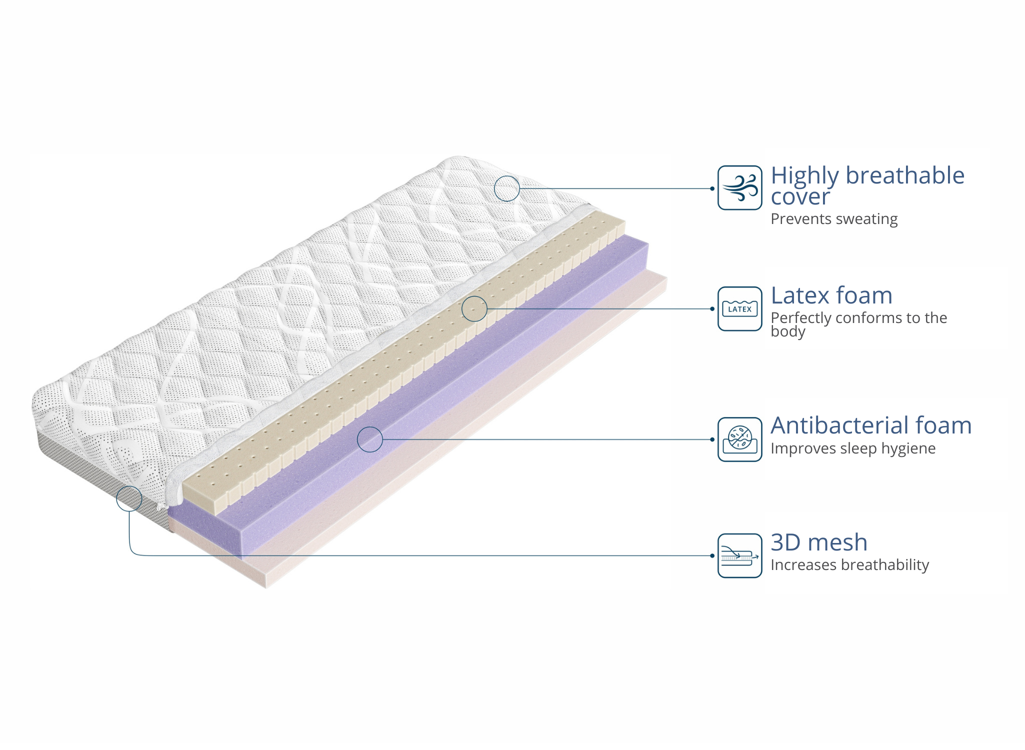 - Hochelastischer Schaum – macht CLEAN zu einer antibakteriellen Matratze. Dein Kind wird oft krank? Dank dieser Schaumart wird das Wachstum von Bakterien gehemmt und das Infektionsrisiko verringert.