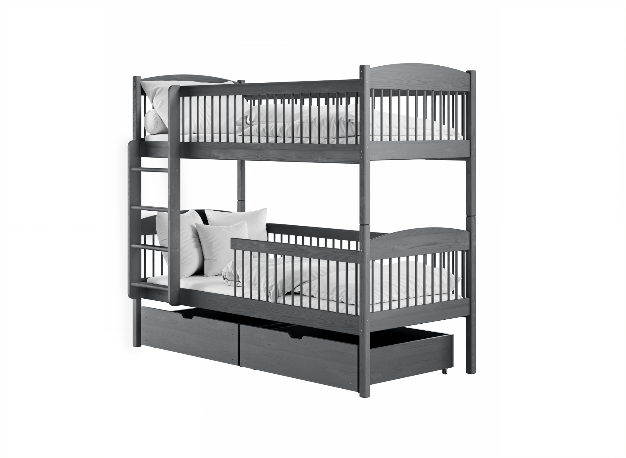 Zwei Schlafebenen und Stauraummöglichkeiten. Entdecken Sie alle Vorteile des Geschwisterbettes LUNA 90x200 in Graphit