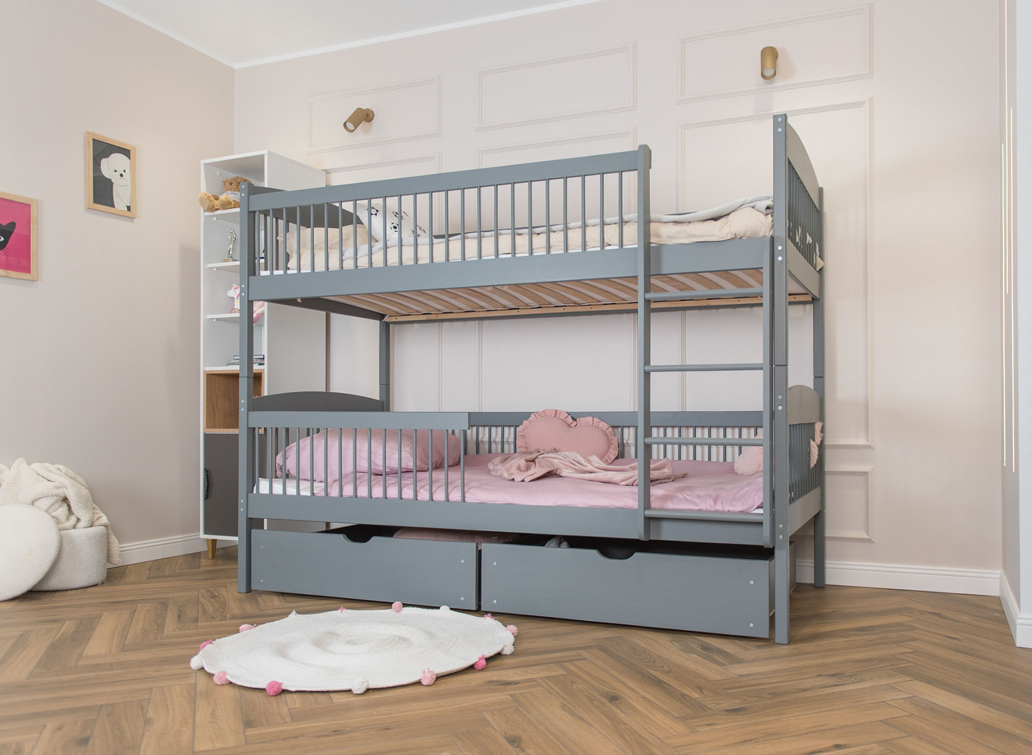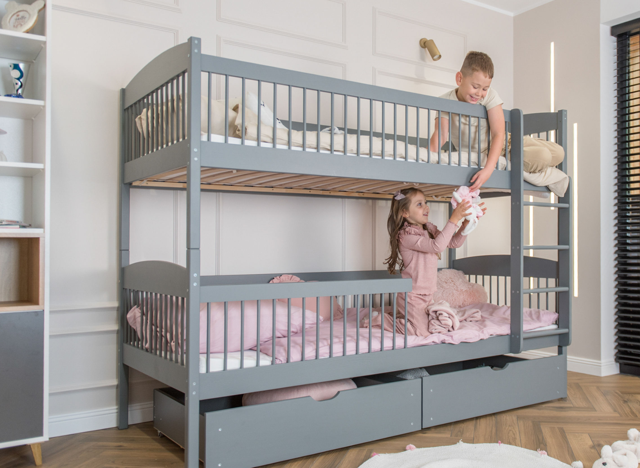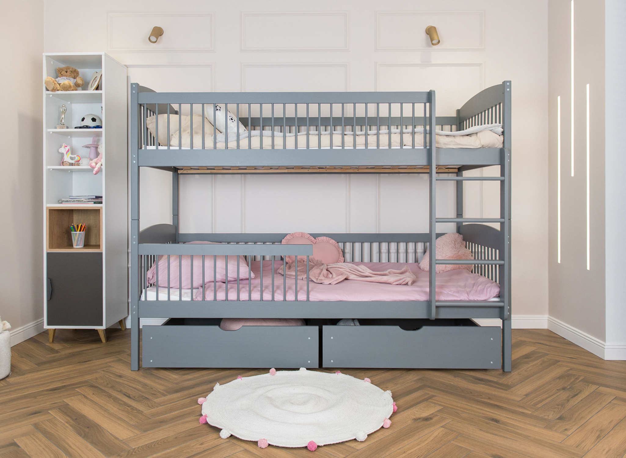 Das multifunktionale Bett für Geschwister von Lano Meble ist ein Must-have für ein gut eingerichtetes Kinderzimmer. Es verfügt über zwei Schlafebenen, sodass jeder Ihrer kleinen Entdecker hier seinen eigenen Platz findet. Zudem garantieren die durchdachten Schutzgeländer mit Sprossenstäben dem Kind Sicherheit während des Schlafs. Das ist jedoch noch nicht alles, was wir mit dem Kinderbett LUNA von LANO Meble geschaffen haben. Sie können dort problemlos Bettwäsche oder die Spielsachen Ihrer geliebten Kleinen verstauen. Schenken Sie Ihren Kindern einen gesunden und ruhigen Schlaf. Statten Sie ihr Schlafzimmer mit dem besten Etagenbett-Modell für Geschwister LUNA aus, wo sie sich ausruhen, ihre Träume erfüllen und ihre geschwisterliche Beziehung vertiefen können.