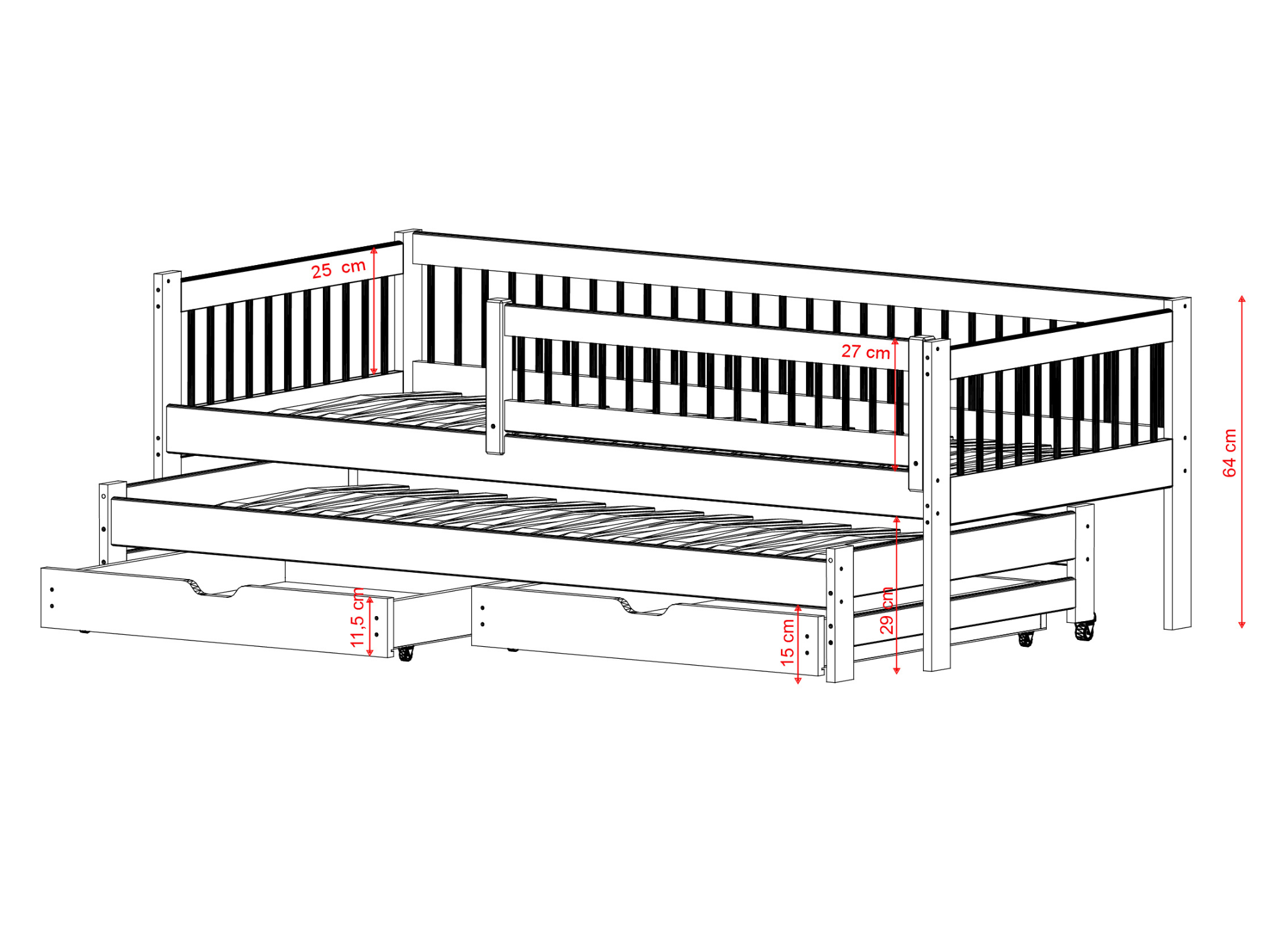 Kinderbett SOFTI ist ein Möbelstück, das jeden Tag ein Lächeln auf das Gesicht Ihres Kindes zaubern wird. Die stabile Konstruktion garantiert jahrelange Haltbarkeit. Das Geheimnis der Konstruktion liegt in der einfachen Form, die aus Kiefernholz besteht. Darüber hinaus werden Sie sicherlich das universelle Design des Kinderbetts SOFTI zu schätzen wissen. Es passt in jede Kinderzimmer-Einrichtung und jeden Stil. Sie müssen sich keine Sorgen machen, dass es nach Renovierungen nicht mehr zum Rest der Einrichtung passt. Warten Sie nicht länger und nutzen Sie dieses großartige Angebot von Lano Meble jetzt. Bei Lano Meble achten wir darauf, dass unsere Produkte nicht nur durch ihr Aussehen, ihren Komfort und ihre Funktionalität, sondern auch durch ihre Sicherheit begeistern. Deshalb wird das Kinderbett SOFTI aus hochwertigem Kiefernholz hergestellt und mit gesundheitlich unbedenklichem Lack beschichtet. Holz ist antistatisch und zieht keinen Staub an. Die Kanten des Bettes und alle sensiblen Teile sind abgerundet, um das Risiko von Reibungen zu minimieren. Ein weiteres Highlight sind Schutzgitter, die das Kind vor dem Herausfallen oder dem Herausklettern während des Schlafes schützen.