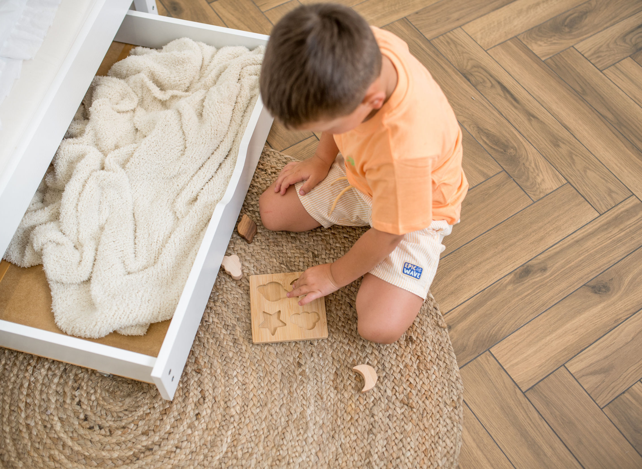 Auch wenn im Kinderzimmer ein Kleiderschrank oder eine separate Garderobe vorhanden ist, werden Sie sicherlich keinen zusätzlichen Stauraum verschmähen - besonders in einem Raum mit begrenzter Fläche. In diesem doppelten Kinderbett wurden zwei ausziehbare Schubladen eingebaut. Was können Sie darin aufbewahren? Dinge, die Sie griffbereit haben möchten - wie zusätzliche Kissen oder eine warme Decke, um Ihr Kind in einer kühlen Nacht zuzudecken. Das Design des AMELKA-Betts beeindruckt jedoch nicht nur durch die ausziehbare untere Plattform, auf der ein weiteres Kind schlafen kann. Die Konstruktion wurde auch mit maximaler Sicherheit für Ihr Kind geplant. Das Hauptbett ist von einer hohen Barriere umgeben, damit Ihr Kind sicher nicht auf die Person darunter fällt. Beide Schlafetagen sind wiederum so niedrig angebracht, dass ein eventueller Sturz auf den Boden nicht schmerzhaft wäre - wenn Sie sich dazu entschließen, die seitlichen Gitter bei älteren Kindern abzunehmen.