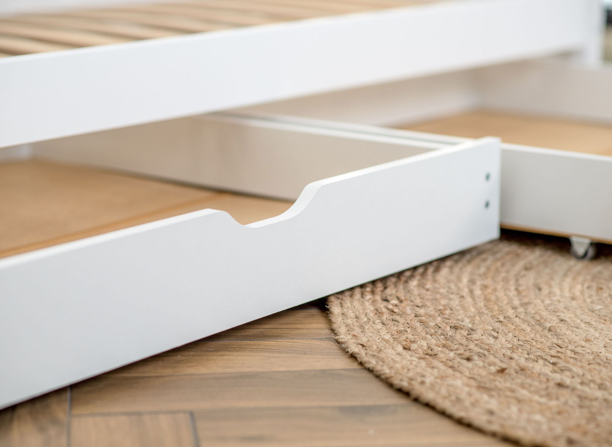 Überprüfe, wie viel in die geräumigen Schubladen des weißen Kinderbetts AMELKA passt