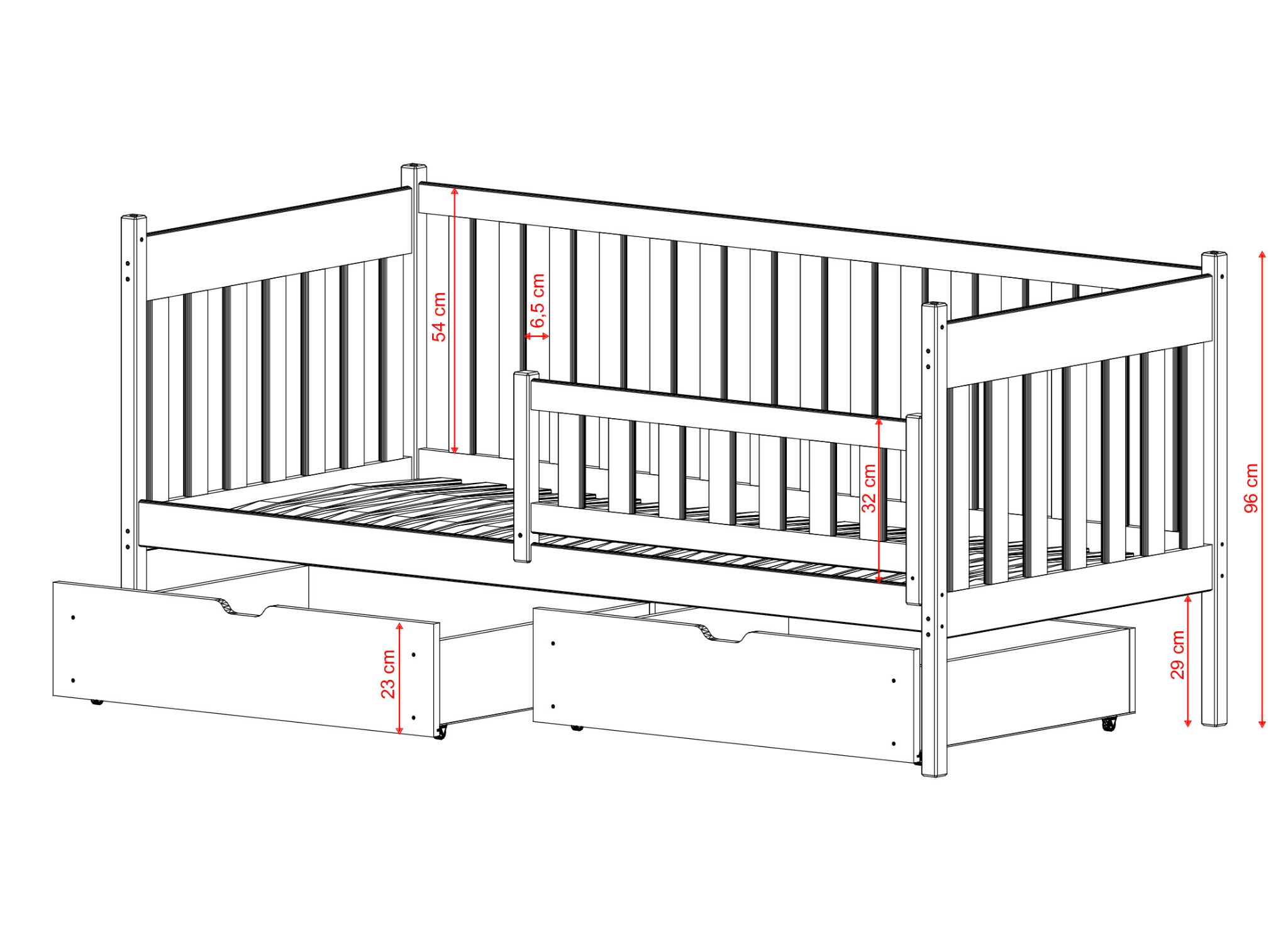 Schon von klein auf möchten Kinder unabhängig sein, also lass dein Kind die Welt nach seinen eigenen Regeln erkunden. Unser Kinderbett ALICJA unterstützt die Entwicklung deines kleinen Menschen. Die Rahmenhöhe ermöglicht es deinem Kind, selbstständig in und aus dem Bett zu steigen. Dies wird sicherlich sein Selbstvertrauen stärken. Schon von den ersten Momenten an kümmern und sorgen Sie sich um Ihr Kind. Lassen Sie uns Ihnen zumindest einen Teil der Sorgen abnehmen. Unser Kinderbett ALICJA ist aus Kiefernholz gefertigt, das mechanischen Beschädigungen widersteht. Wir denken auch an Farben. Wir wissen, dass Kinder in frühen Entwicklungsstadien die Welt erkunden, indem sie verschiedene Gegenstände in den Mund nehmen. Deshalb ist unser Kinderbett ALICJA mit Farben bemalt, die der Gesundheit Ihres Kindes nicht schaden.