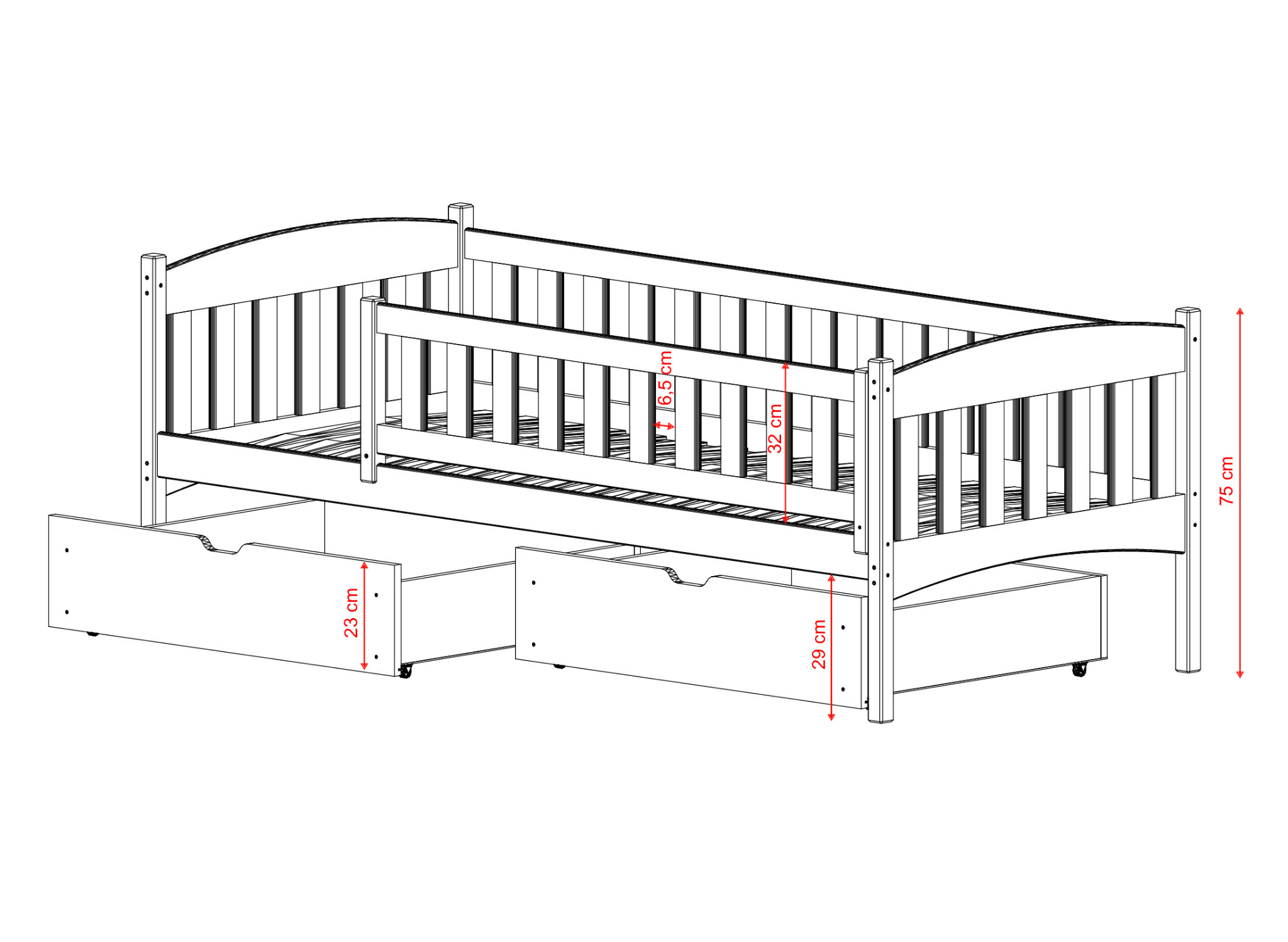 Wir setzen alles daran, dass unsere Möbel nicht nur durch ihr außergewöhnliches Aussehen beeindrucken, sondern auch zu hundert Prozent sicher für Kinder sind. Aus diesem Grund haben wir eine spezielle Konstruktion für das GUCIO Bett mit hohen Geländern entwickelt, die wirksam vor dem Herunterfallen schützen. Auch das Material, aus dem der Rahmen gefertigt ist, stellt keine Gefahr für das Kind dar - es handelt sich um Kiefernholz, das mit ungiftigen Farben und Lacken behandelt wurde. Obwohl das Bett die meiste Aufmerksamkeit auf sich zieht, ist die Matratze dennoch die Garantie für eine gute Nachtruhe. Eine gut passende Matratze gewährleistet die Unterstützung der Wirbelsäule des Kindes und somit eine effektive Erholung. Das Kinderbett GUCIO ist sowohl mit einer im Set enthaltenen Matratze als auch separat erhältlich - je nachdem, was Ihnen besser gefällt.