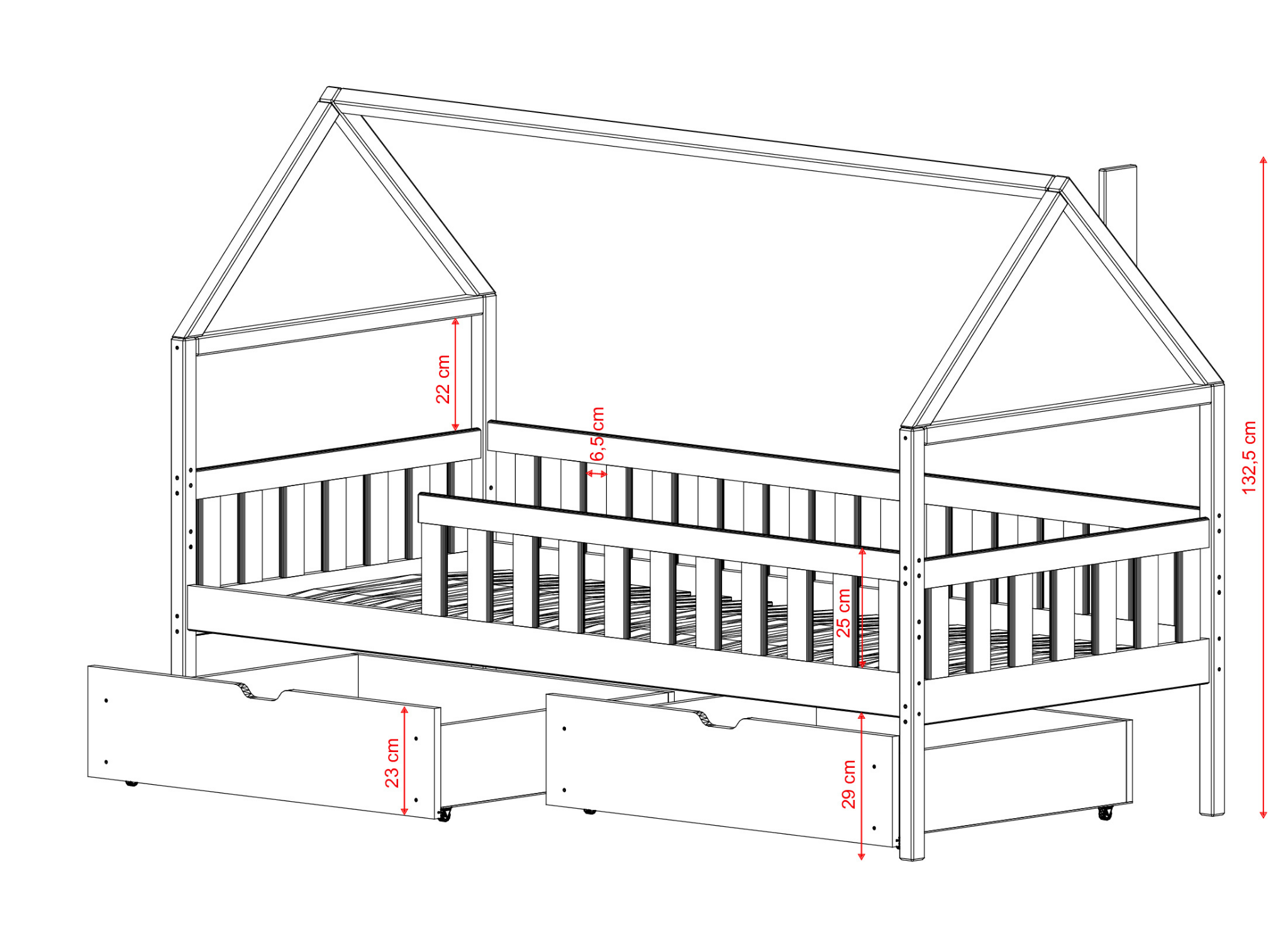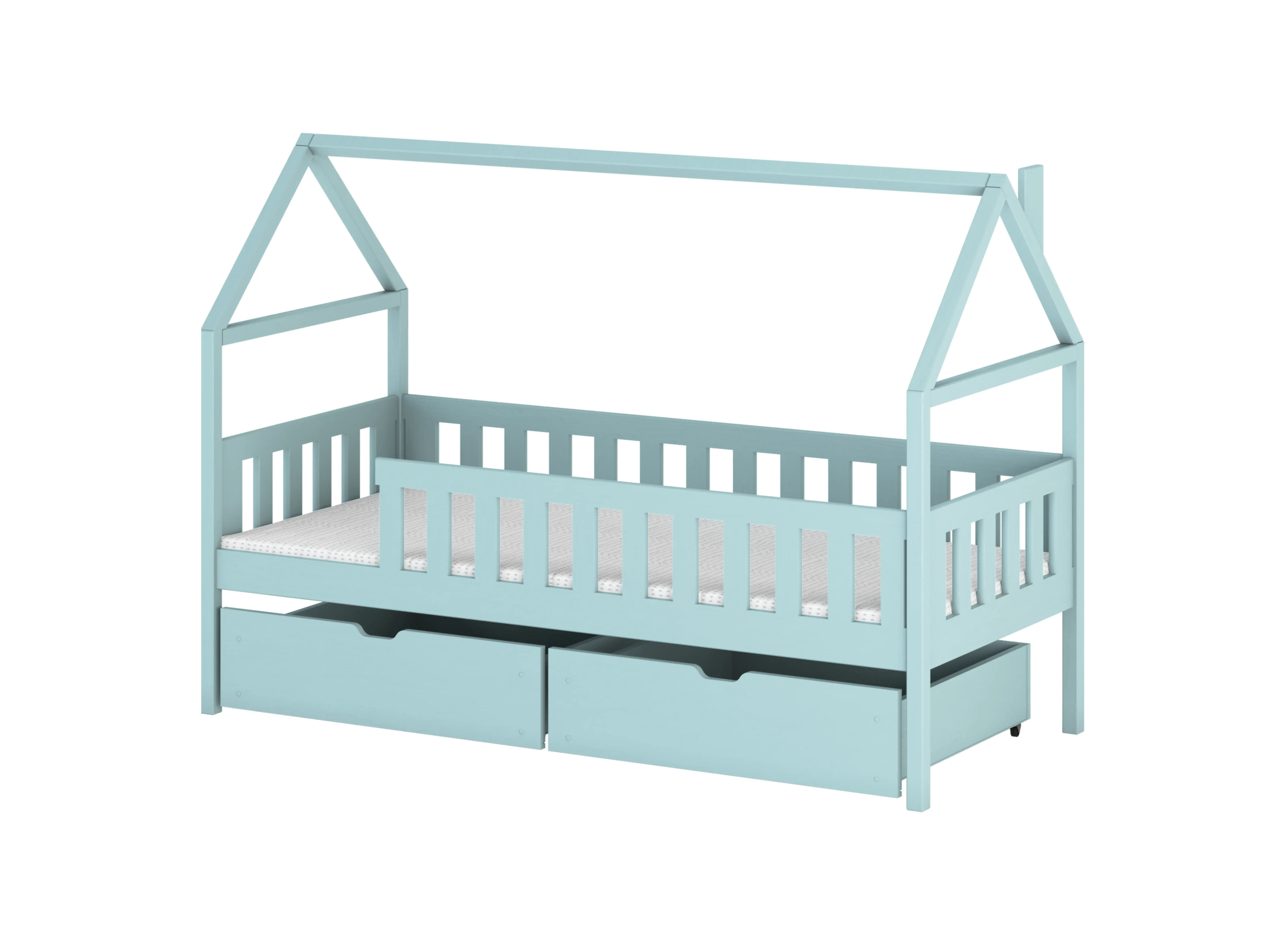 All unsere Produkte erfüllen die höchsten Sicherheitsstandards, die für Kindermöbel vorgesehen sind. Für die Herstellung dieses Modells verwenden wir Kiefernholz, das nicht nur langlebig ist, sondern auch aus nachhaltiger Forstwirtschaft stammt. Das DOMI Hausbett zeichnet sich somit durch seine ökologische Natur aus. Wir können es in der Farbe lackieren, die Ihr Kind sich wünscht - und das mit ungiftigen Lacken. Im Kinderzimmer fehlt es immer an Stauraum - sei es für Spielzeug, Winterkleidung oder Ersatzbettwäsche. Dieses Modell Kindermöbel ist mit zwei ausziehbaren Schubladen mit viel Stauraum ausgestattet, die sicherlich nützlich sein werden.