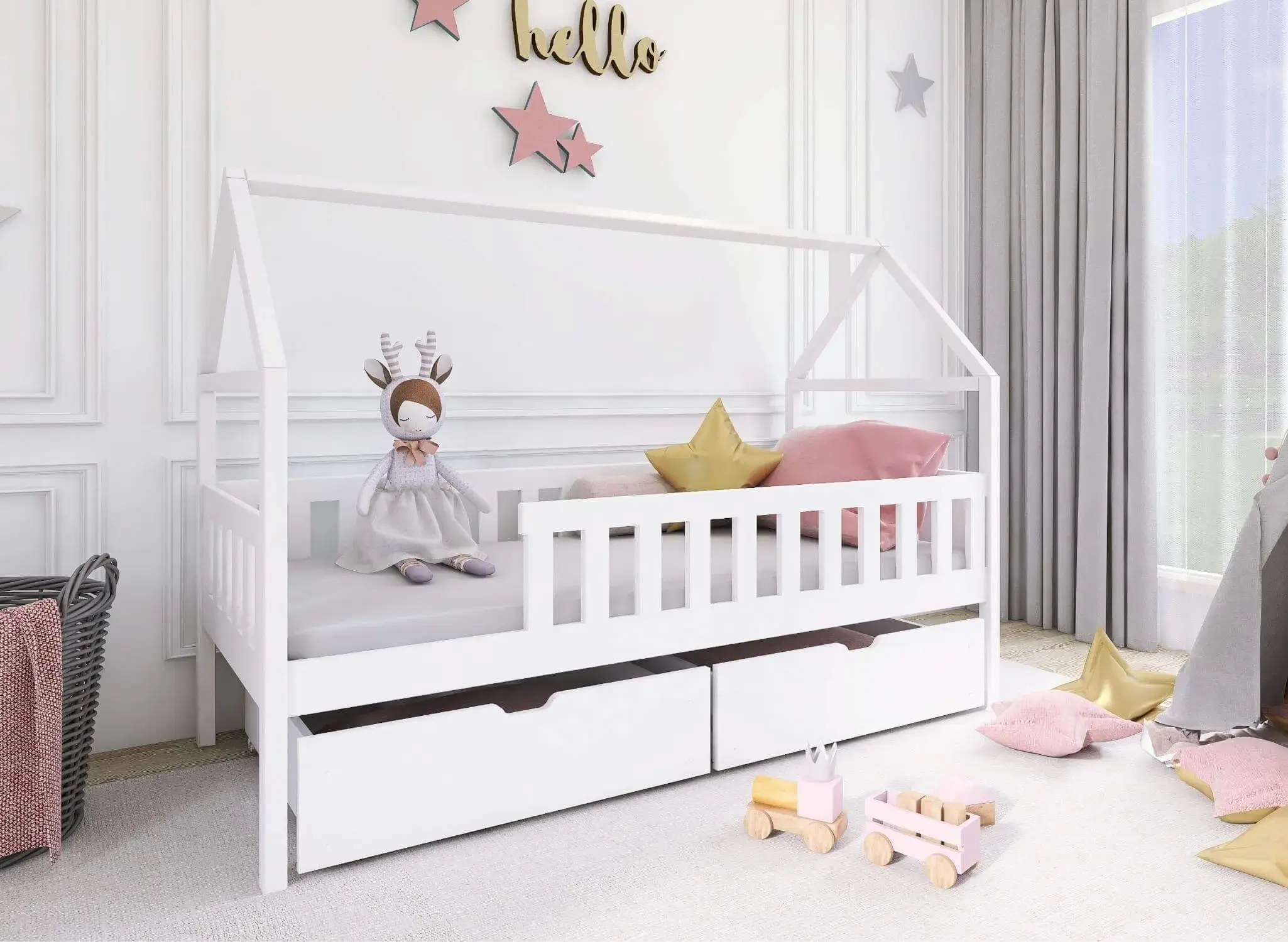All unsere Produkte erfüllen die höchsten Sicherheitsstandards, die für Kindermöbel vorgesehen sind. Für die Herstellung dieses Modells verwenden wir Kiefernholz, das nicht nur langlebig ist, sondern auch aus nachhaltiger Forstwirtschaft stammt. Das DOMI Hausbett zeichnet sich somit durch seine ökologische Natur aus. Wir können es in der Farbe lackieren, die Ihr Kind sich wünscht - und das mit ungiftigen Lacken. Im Kinderzimmer fehlt es immer an Stauraum - sei es für Spielzeug, Winterkleidung oder Ersatzbettwäsche. Dieses Modell Kindermöbel ist mit zwei ausziehbaren Schubladen mit viel Stauraum ausgestattet, die sicherlich nützlich sein werden.
