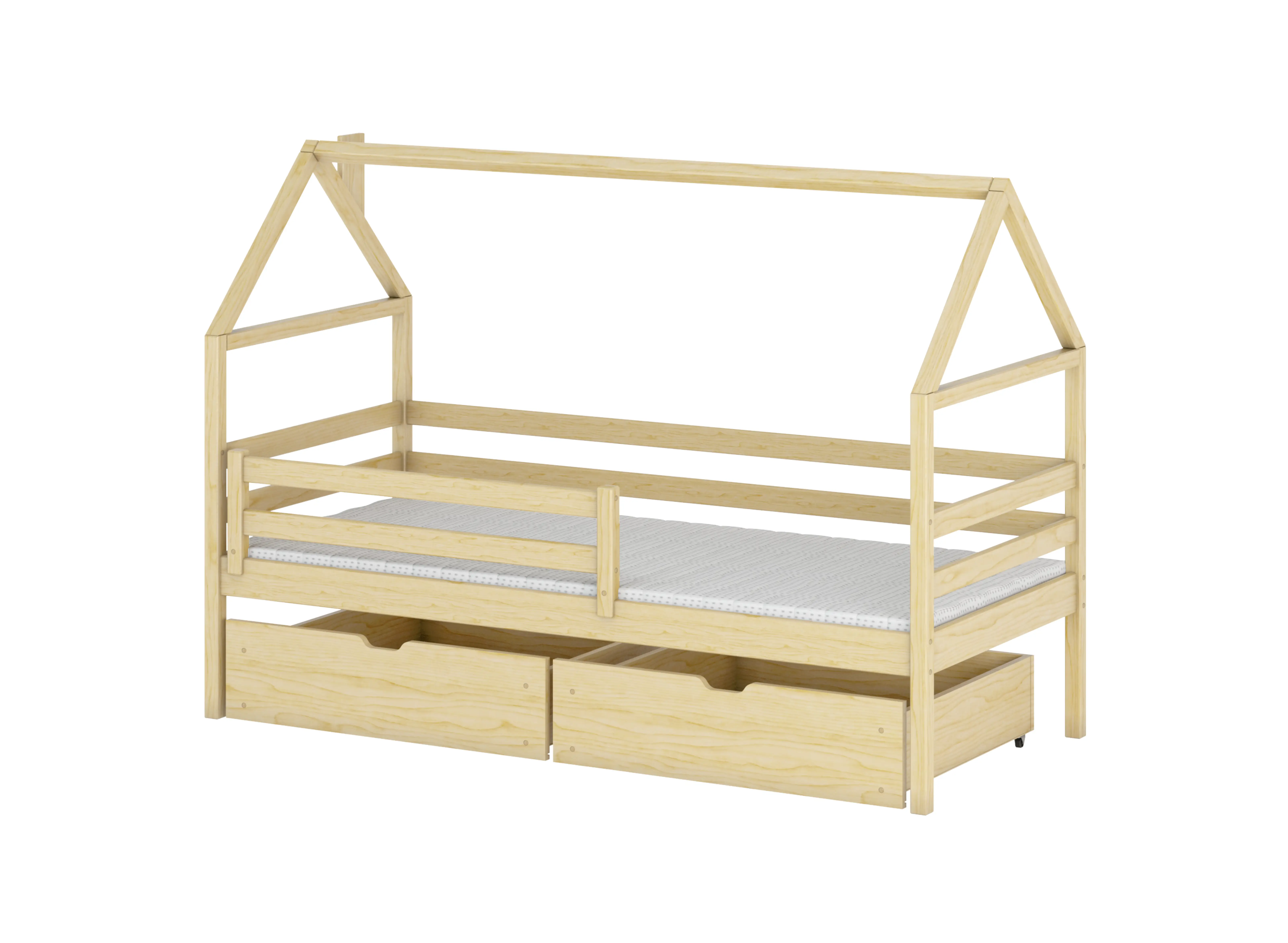 Kinderbett im Hausstil ARON von Lano Meble ist die Erfüllung des Traums jedes Kindes. Dieses Möbelstück ist in einer Form gefertigt, die die Kreativität jedes Kleinkindes anregt. Durchdachte Konstruktion, hohe Strapazierfähigkeit und Stabilität garantieren Jahre unkomplizierter Nutzung und das Lächeln Ihres Kleinen jeden Tag. Bei Lano Meble legen wir nicht nur Wert auf das visuelle Erscheinungsbild, sondern auch auf die Funktionalität. Das Kinderbett ARON ist nicht nur ein bequemes Schlafmöbel, sondern auch eine Möglichkeit, verschiedene Kinderaccessoires zu lagern. Unter dem Bett gibt es genug Platz für 2 geräumige Schubladen. Sie können sie zusätzlich erwerben, indem Sie das Produkt konfigurieren. Spaß und bequeme Erholung sind garantiert.