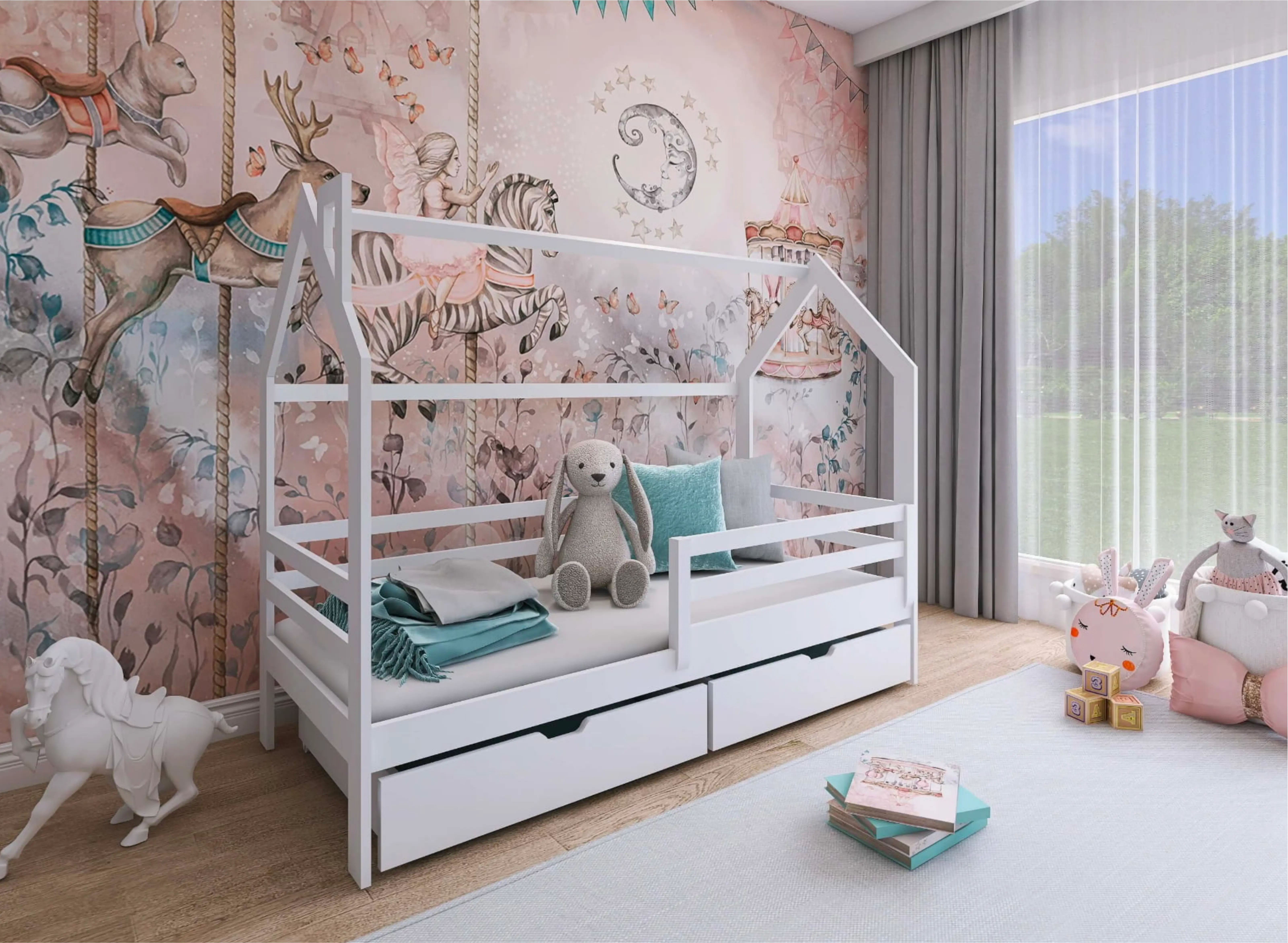 Ein funktionales Kinderzimmer mit einem weißen LILA-Hausbett sorgt für den Seelenfrieden der Eltern