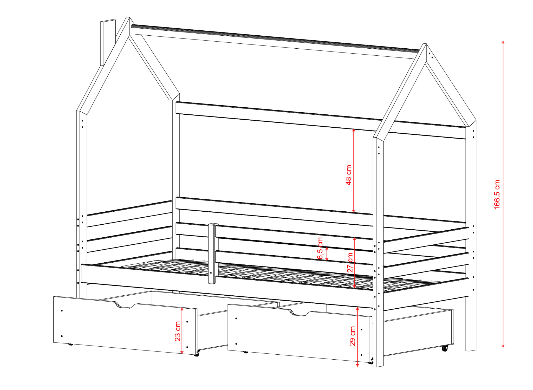 Bei Lano Meble legen wir Wert auf die Sicherheit und Gesundheit Ihres Kindes, daher werden unsere Kinderbetten aus naturbelassenem Kiefernholz hergestellt und mit zertifizierten Farben lackiert. Wir wissen, dass ein ruhiger Schlaf die Grundlage für die Entwicklung eines jeden Kleinkindes ist. In unseren Möbeln finden Sie ausschließlich Materialien von höchster Qualität. Entdecken Sie, was das Kinderbett Haus LILA zu bieten hat und welche seine größten Vorteile sind. Das Gestell des Kinderbettes LILA in Hausform ist vollständig aus Kiefernholz gefertigt. Oben befindet sich ein Holzrahmen, der an ein Dach erinnert, und unten eine Birkenleiste, die als Matratzenrahmen dient. Sie haben auch zwei geräumige Schubladen zur Verfügung, die als praktischer Stauraum für Bettwäsche und Spielzeug dienen. Mit unserem Kinderbett LILA in Hausform gewinnen Sie zusätzlichen Platz im Kinderzimmer.