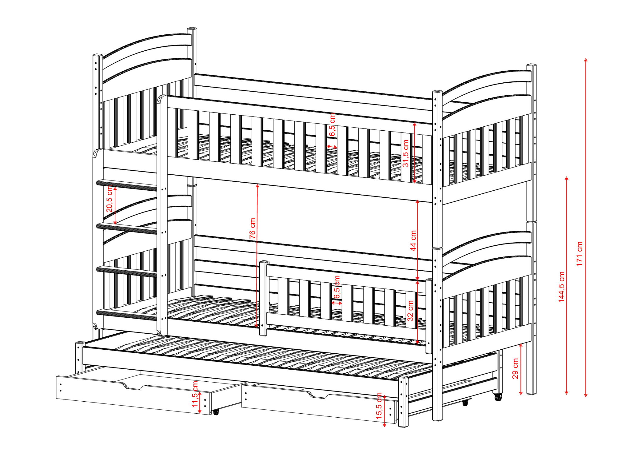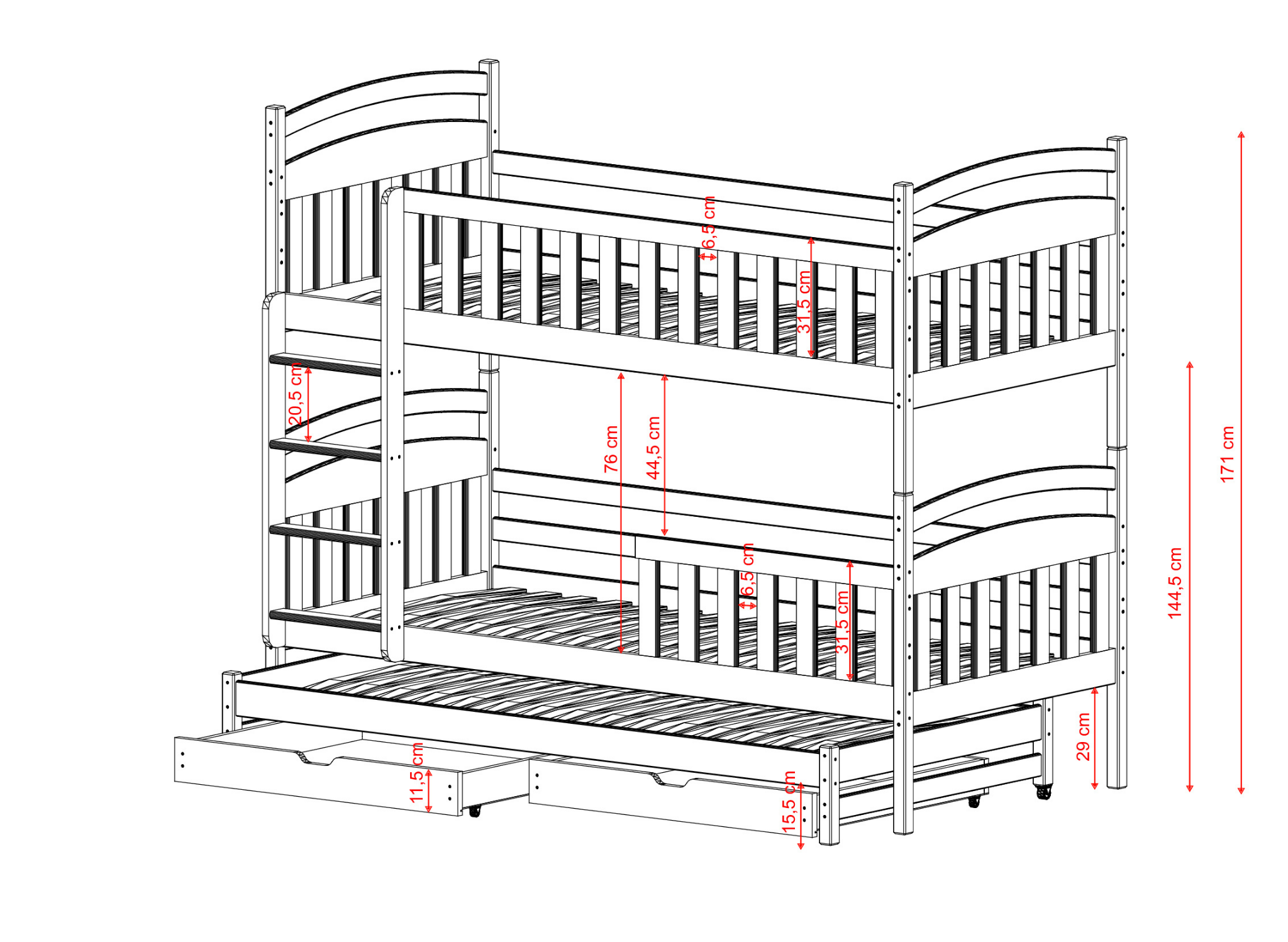 Etagenbett VIKI ist aus Kiefernholz gefertigt. Dies ist ein haltbares Material, das mechanischen Schäden und schwerer Belastung standhält. Die Konstruktion des Geschwisterbettes VIKI ist daher äußerst solide. Außerdem ist es ein Bett mit Schubladen, die zusätzlichen Stauraum für Bettwäsche oder Spielzeug bieten.