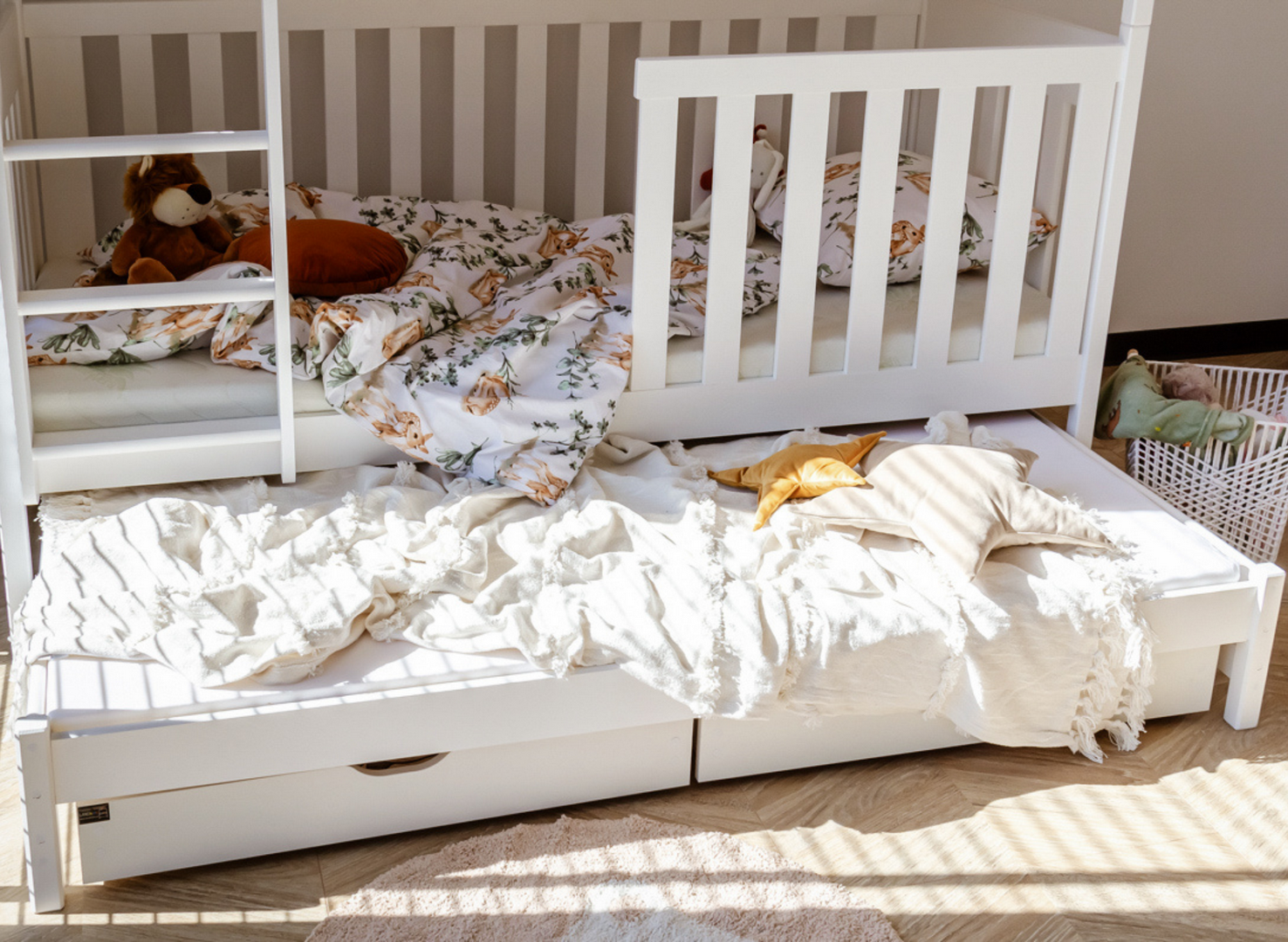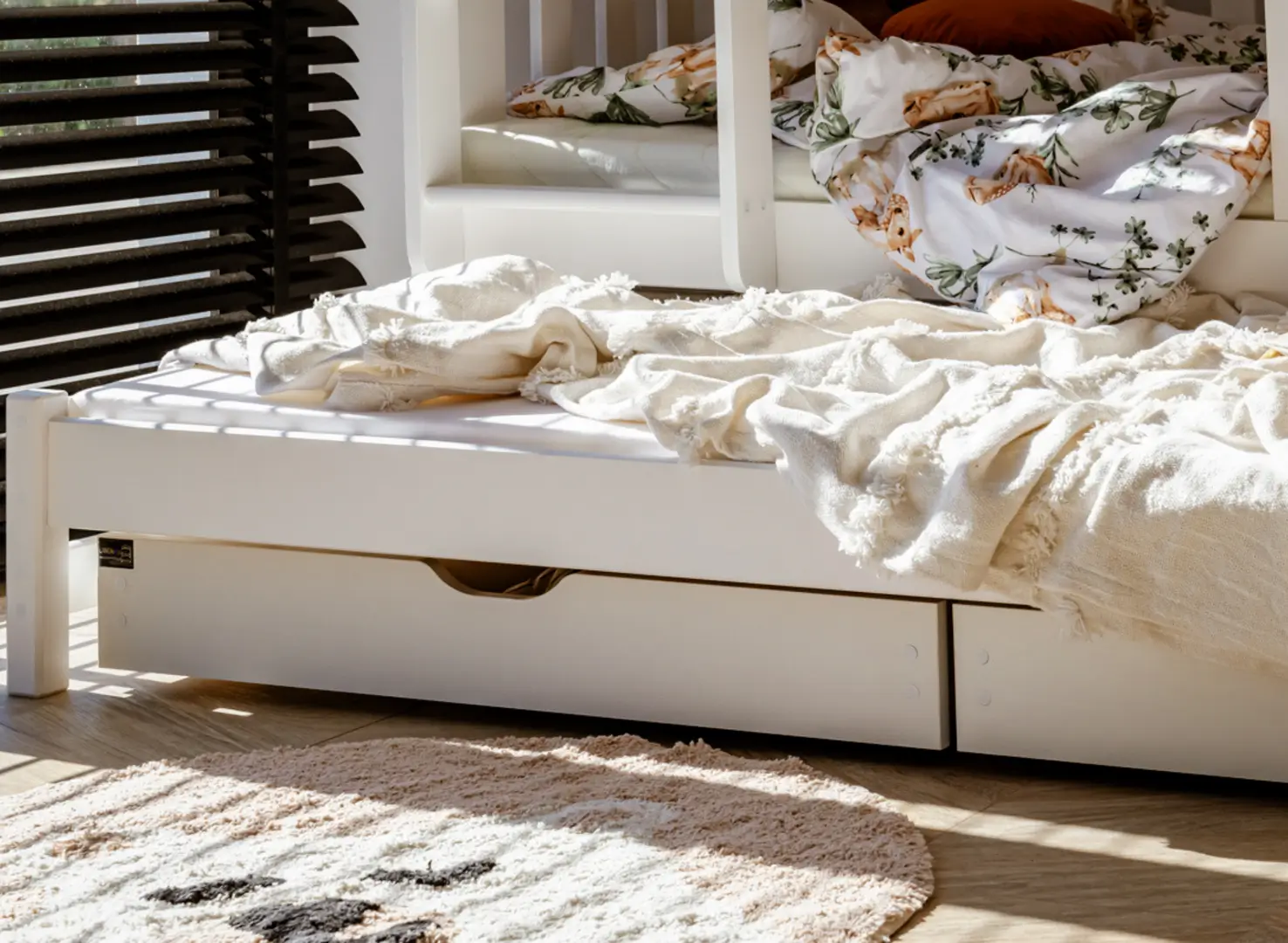 In einem kleinen Zimmer, besonders für Geschwister, fehlt es immer an Schränken und Regalen. Das Etagenbett EMILKA von Lano Meble ist mit geräumigen Schubladen unter der ausziehbaren Plattform ausgestattet. Sie eignen sich hervorragend zur Aufbewahrung von Bettwäsche, Spielzeug oder saisonaler Kleidung. Dies ist ein Beispiel für die maximale Nutzung des Möbelpotenzials im Kinderzimmer.