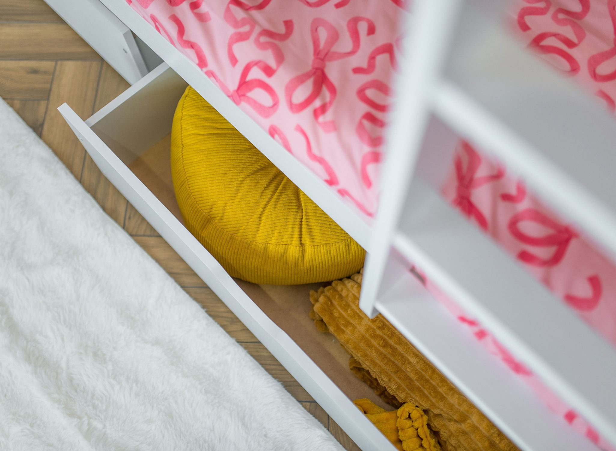 Das Etagenbett MONIKA ist eine ausgezeichnete Lösung nicht nur für kleine Räume, sondern auch für jedes Kinderzimmer, in dem Geschwister leben. Warum? Ein solches Bett regt die Fantasie an und fördert die Kreativität. Betrachten Sie auch die praktische Seite des Etagenbetts für Geschwister MONIKA. Sie können beide Teile getrennt aufstellen und so zwei voneinander unabhängige Schlafbereiche schaffen. Wenn Sie unser Etagenbett MONIKA bestellen, geben wir Ihnen viel Freiheit. Sie können das Möbelstück personalisieren und es an die Bedürfnisse Ihrer Kinder anpassen. Sie entscheiden, ob der Raum unter dem Bett mit zwei Schubladen ausgestattet sein soll. Bei der Bestellung treffen Sie auch die Entscheidung, ob die Geländer am Etagenbett MONIKA fest montiert oder abnehmbar sein sollen.