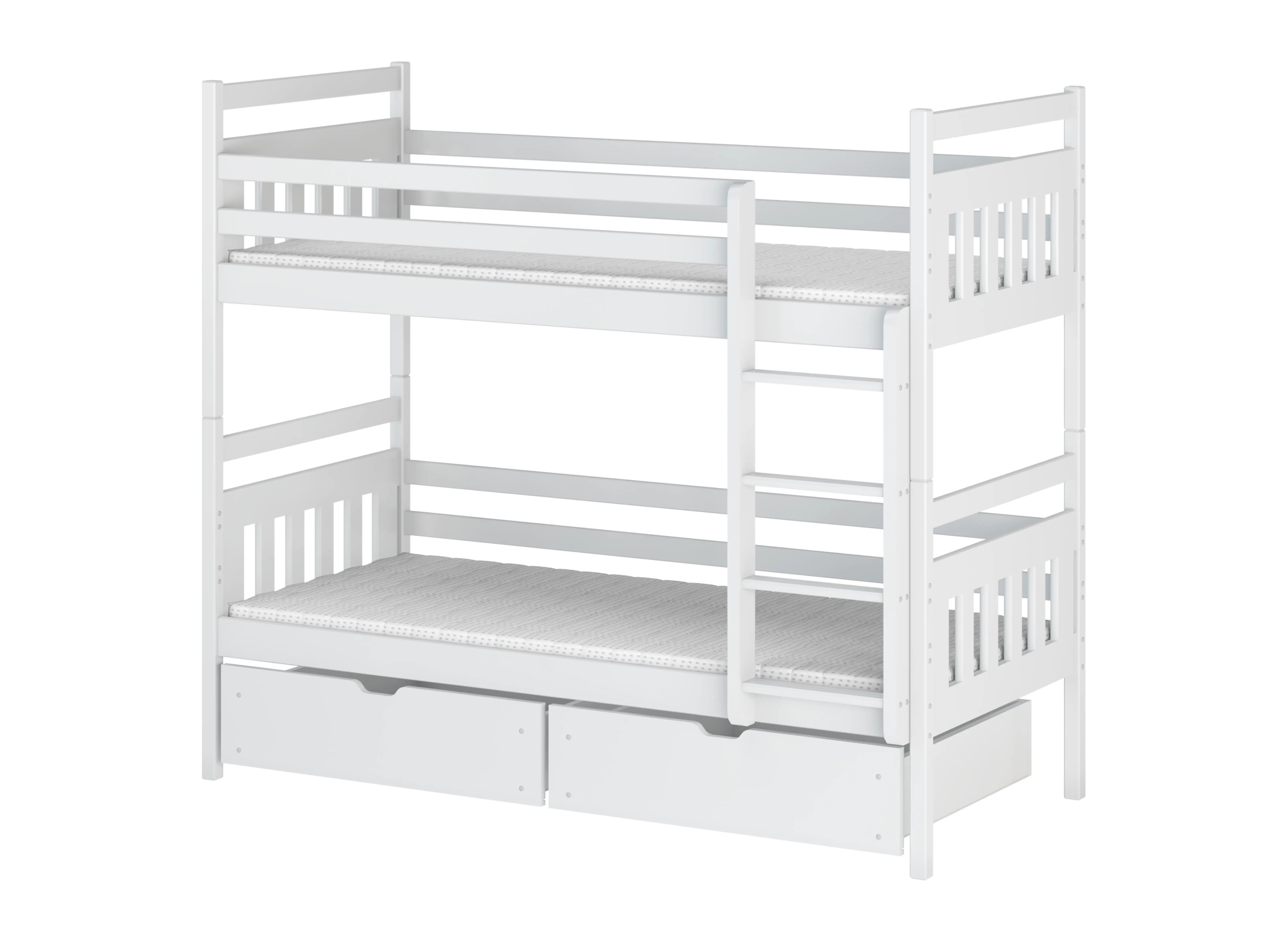 Das Etagenbett ADAŚ erfüllt diese Anforderungen perfekt. Es ist zu 100% aus Kiefernholz gefertigt, das sich durch sichere Geländer und eine bequeme Leiter auszeichnet. Das Etagenbett ADAŚ wird jede Zeit überstehen. Holz ist auch ein großartiges Material für Allergiker - es hat antistatische Eigenschaften (es zieht keinen Staub an). Die Holzbretter, aus denen dieses Möbelstück gefertigt ist, sind angenehm anzufassen für kleine Hände. Sie verleihen Gemütlichkeit und schaffen eine beruhigende Atmosphäre, in der sich jedes Kleinkind wohlfühlen wird. Die Holzelemente sind mit gesundheitlich unbedenklichen Farben bemalt. Das Etagenbett ADAŚ mit der Möglichkeit, Schubladen hinzuzufügen garantiert nicht nur einen bequemen und ruhigen Schlaf, sondern auch schöne ästhetische Werte. Die praktischen Schubladen unter dem Bett können als Schatzkammern oder zur Aufbewahrung von Heimtextilien und anderen Kleinigkeiten dienen. Die praktischen Holzgeländer verdienen Beachtung, sie schützen das Kind vor dem Herausfallen und geben den Eltern Ruhe. Die Holzleiter ist entsprechend geformt und ermöglicht einen problemlosen Zugang zur oberen Etage.
