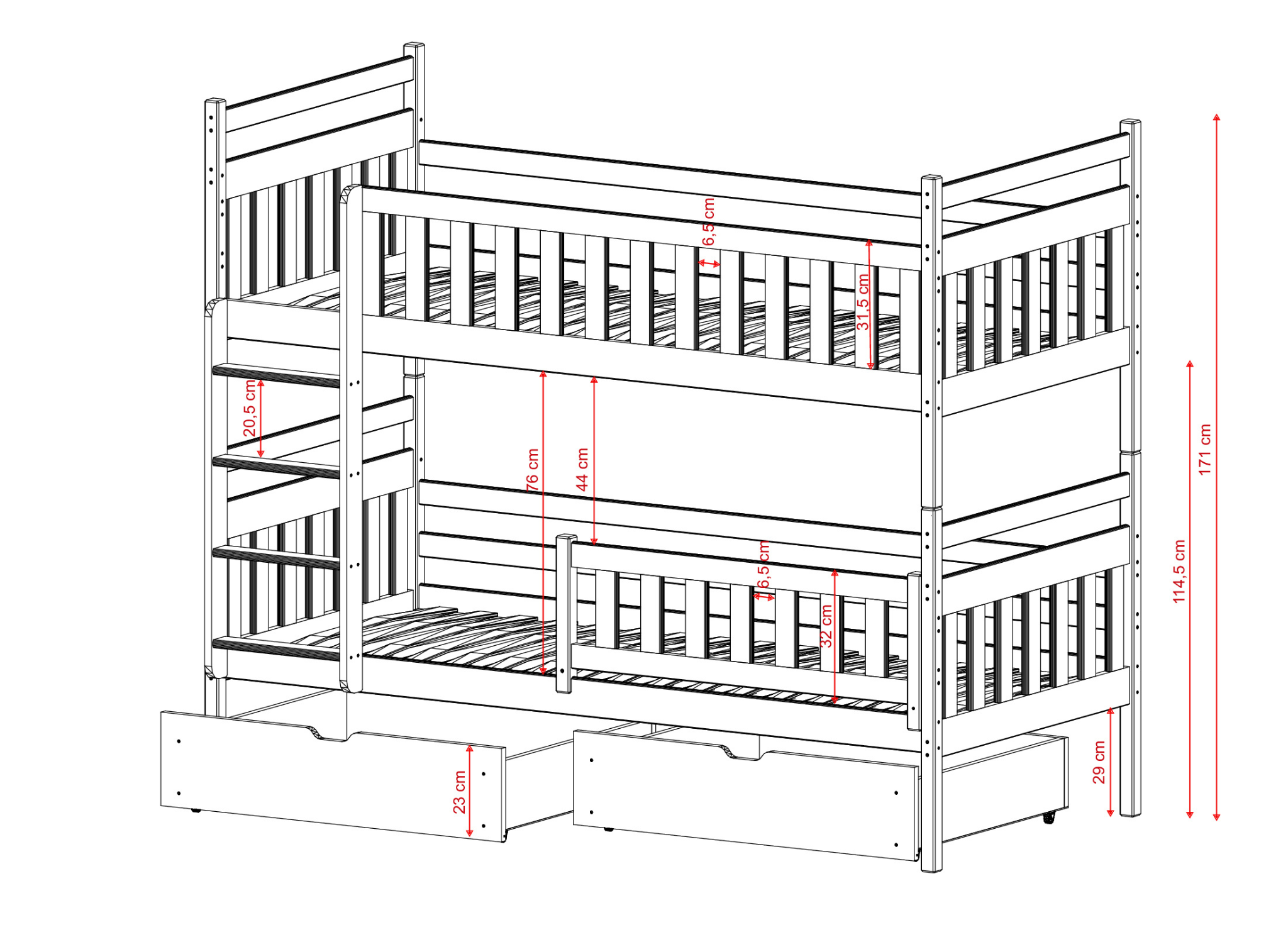 Das Etagenbett MONIKA ist eine ausgezeichnete Lösung nicht nur für kleine Räume, sondern auch für jedes Kinderzimmer, in dem Geschwister leben. Warum? Ein solches Bett regt die Fantasie an und fördert die Kreativität. Betrachten Sie auch die praktische Seite des Etagenbetts für Geschwister MONIKA. Sie können beide Teile getrennt aufstellen und so zwei voneinander unabhängige Schlafbereiche schaffen. Wenn Sie unser Etagenbett MONIKA bestellen, geben wir Ihnen viel Freiheit. Sie können das Möbelstück personalisieren und es an die Bedürfnisse Ihrer Kinder anpassen. Sie entscheiden, ob der Raum unter dem Bett mit zwei Schubladen ausgestattet sein soll. Bei der Bestellung treffen Sie auch die Entscheidung, ob die Geländer am Etagenbett MONIKA fest montiert oder abnehmbar sein sollen.