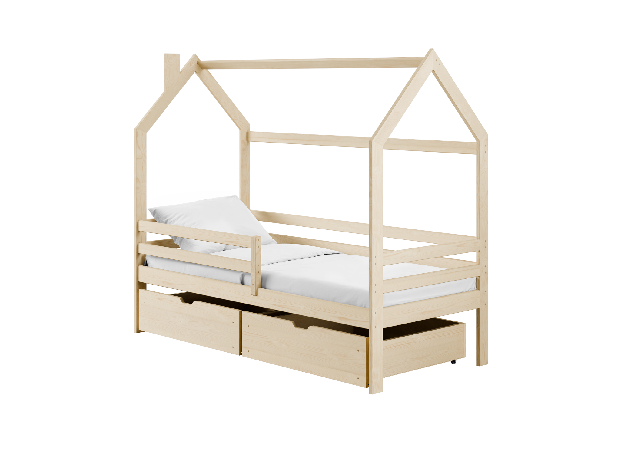Bei Lano Meble legen wir Wert auf die Sicherheit und Gesundheit Ihres Kindes, daher werden unsere Kinderbetten aus naturbelassenem Kiefernholz hergestellt und mit zertifizierten Farben lackiert. Wir wissen, dass ein ruhiger Schlaf die Grundlage für die Entwicklung eines jeden Kleinkindes ist. In unseren Möbeln finden Sie ausschließlich Materialien von höchster Qualität. Entdecken Sie, was das Kinderbett Haus LILA zu bieten hat und welche seine größten Vorteile sind. Das Gestell des Kinderbettes LILA in Hausform ist vollständig aus Kiefernholz gefertigt. Oben befindet sich ein Holzrahmen, der an ein Dach erinnert, und unten eine Birkenleiste, die als Matratzenrahmen dient. Sie haben auch zwei geräumige Schubladen zur Verfügung, die als praktischer Stauraum für Bettwäsche und Spielzeug dienen. Mit unserem Kinderbett LILA in Hausform gewinnen Sie zusätzlichen Platz im Kinderzimmer.
