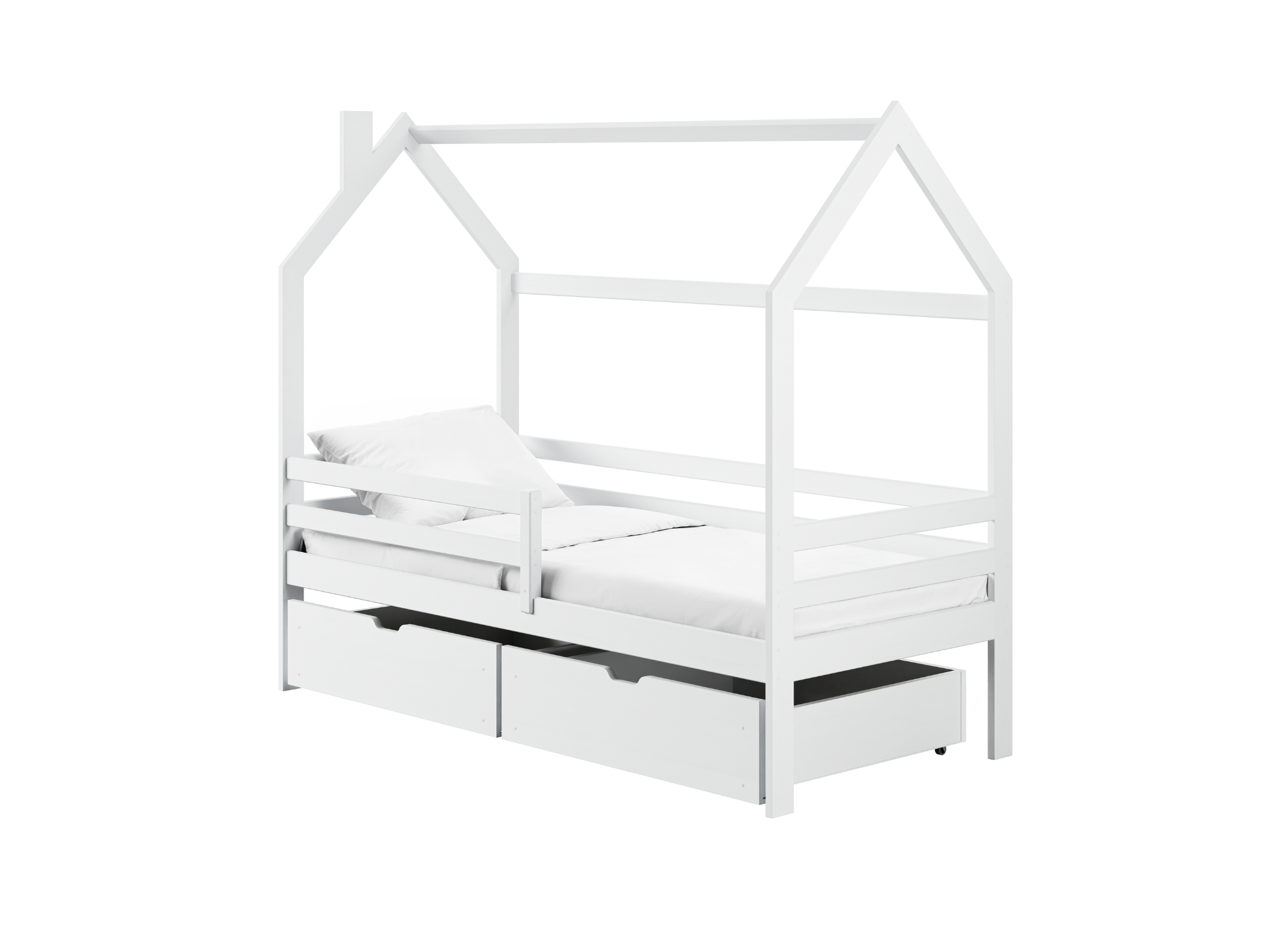 Bei Lano Meble legen wir Wert auf die Sicherheit und Gesundheit Ihres Kindes, daher werden unsere Kinderbetten aus naturbelassenem Kiefernholz hergestellt und mit zertifizierten Farben lackiert. Wir wissen, dass ein ruhiger Schlaf die Grundlage für die Entwicklung eines jeden Kleinkindes ist. In unseren Möbeln finden Sie ausschließlich Materialien von höchster Qualität. Entdecken Sie, was das Kinderbett Haus LILA zu bieten hat und welche seine größten Vorteile sind. Das Gestell des Kinderbettes LILA in Hausform ist vollständig aus Kiefernholz gefertigt. Oben befindet sich ein Holzrahmen, der an ein Dach erinnert, und unten eine Birkenleiste, die als Matratzenrahmen dient. Sie haben auch zwei geräumige Schubladen zur Verfügung, die als praktischer Stauraum für Bettwäsche und Spielzeug dienen. Mit unserem Kinderbett LILA in Hausform gewinnen Sie zusätzlichen Platz im Kinderzimmer.