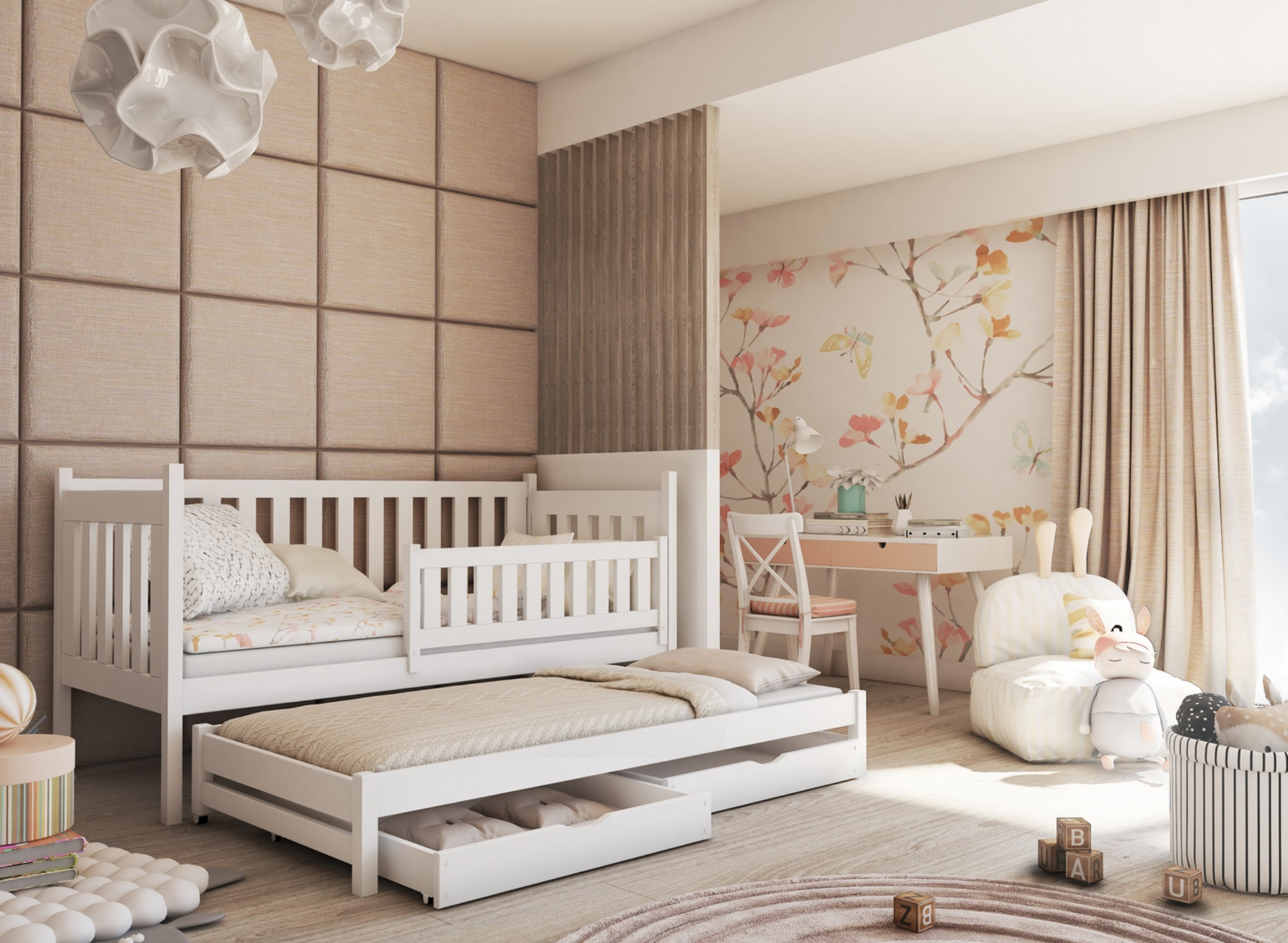 Ein weißes Geschwisterbett KAJA mit Schubladen ist eine Chance für mehr Ordnung
