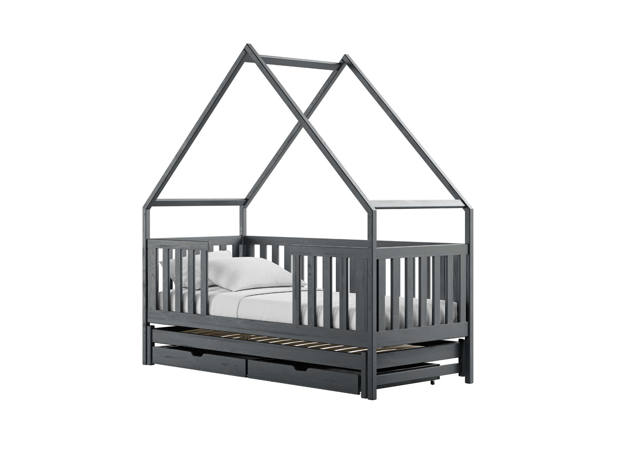 Das MAGIC Hausbett sieht auf den ersten Blick aus wie viele andere, aber seine Einzigartigkeit liegt im Detail. Das Etagenbett aus Kiefernholz ist mit einem ausziehbaren Teil ausgestattet, mit dem sich zwei separate Schlafbereiche schaffen lassen. Das Modell MAGIC Bett ist ein niedriges Etagenbett, daher ist es eine ideale Lösung für Kinder, die gerade lernen, alleine zu schlafen. Übermäßige Höhe löst oft Angst bei ihnen aus, daher ist es ratsam, sich für ein etwas niedrigeres Modell zu entscheiden, besonders am Anfang. Kieferholzbetten haben eine universelle Farbe und passen gut zu den anderen Elementen der Kinderzimmerausstattung. Das Kinderbett sieht schön in einem Raum aus, der in hellen Farben eingerichtet ist. Das MAGIC Bettmodell fügt sich in den skandinavischen Stil ein, was eine Antwort auf die Bedürfnisse von Eltern darstellt, die Einfachheit bevorzugen. Das MAGIC Hausbett mit ausziehbarem Teil ist eine praktische Lösung für Geschwister, insbesondere bei geringem Altersunterschied.