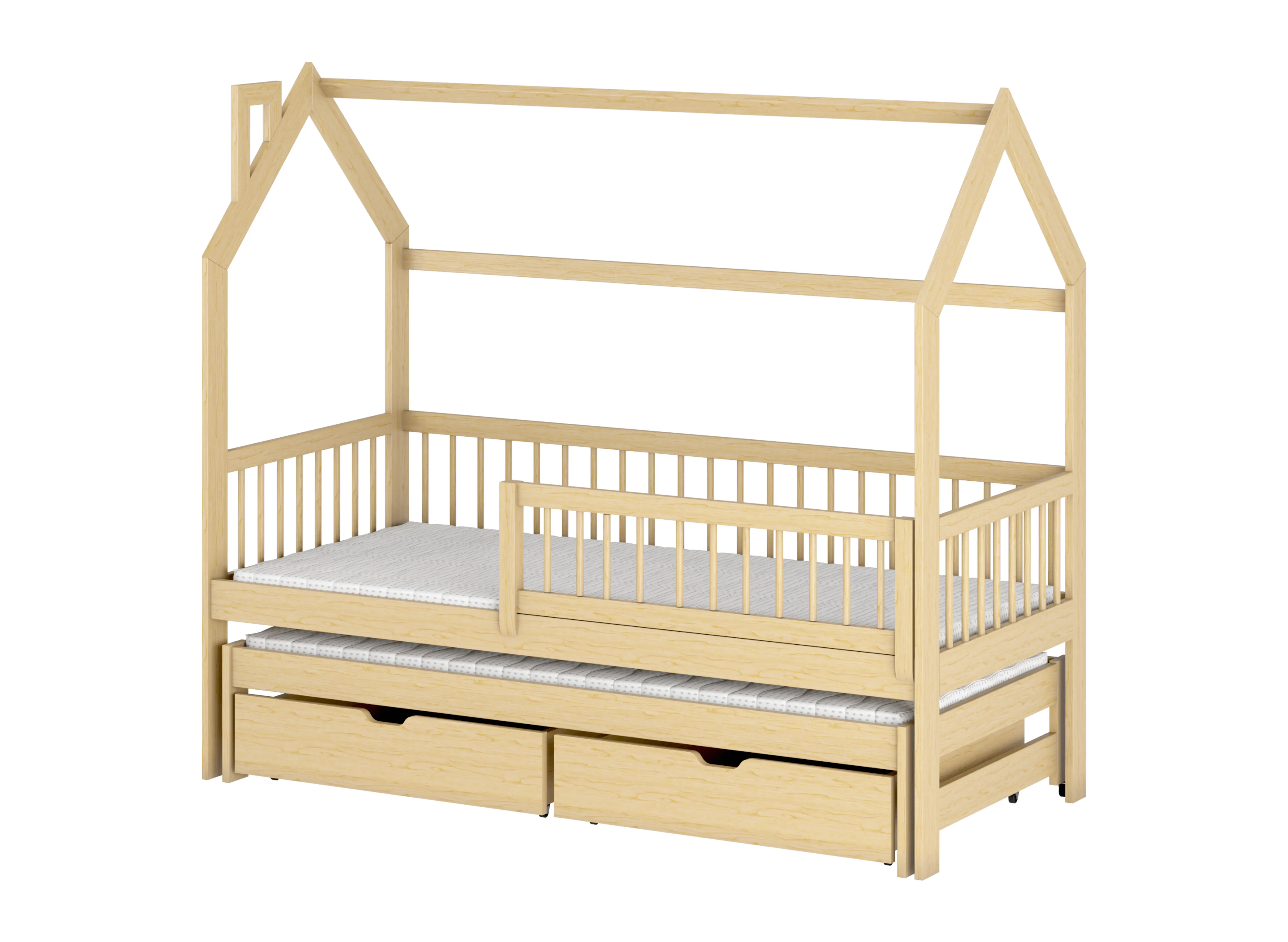 Trotz des charmanten Designs hat das Kinderbett Haus PAPI eine recht einfache Konstruktion, die sich in jedes Kinderzimmer einfügt. Das ist ein großer Vorteil. Selbst wenn eine Renovierung des Zimmers geplant ist, können Sie sicher sein, dass dieses Bett perfekt in jede Einrichtung passt. Wählen Sie das Kinderbett Haus PAPI und Sie werden sehen, dass Ihr Kind nie wieder Probleme beim Einschlafen haben wird. Mit ihm schaffen Sie eine märchenhafte und unglaublich gemütliche Atmosphäre im Kinderzimmer. Es gibt viele Gründe, sich für das Kinderbett Haus PAPI zu entscheiden. Vor allem bietet es eine große Funktionalität. Vor allem verfügt das Bett über ein ausschiebbares Bett, so dass Eltern bei Bedarf neben dem Kleinkind wachen können. Es ist auch ein zweiter, komfortabler Schlafplatz für Geschwister. Diese kompakte Lösung spart viel Platz. Das ist jedoch nicht alles. Das Kinderbett Haus PAPI hat auch zwei große und geräumige Schubladen, die unter dem Gestell Platz finden. Mit ihnen können Sie verschiedene Kleinigkeiten aufbewahren, so dass endlich Ordnung herrscht.