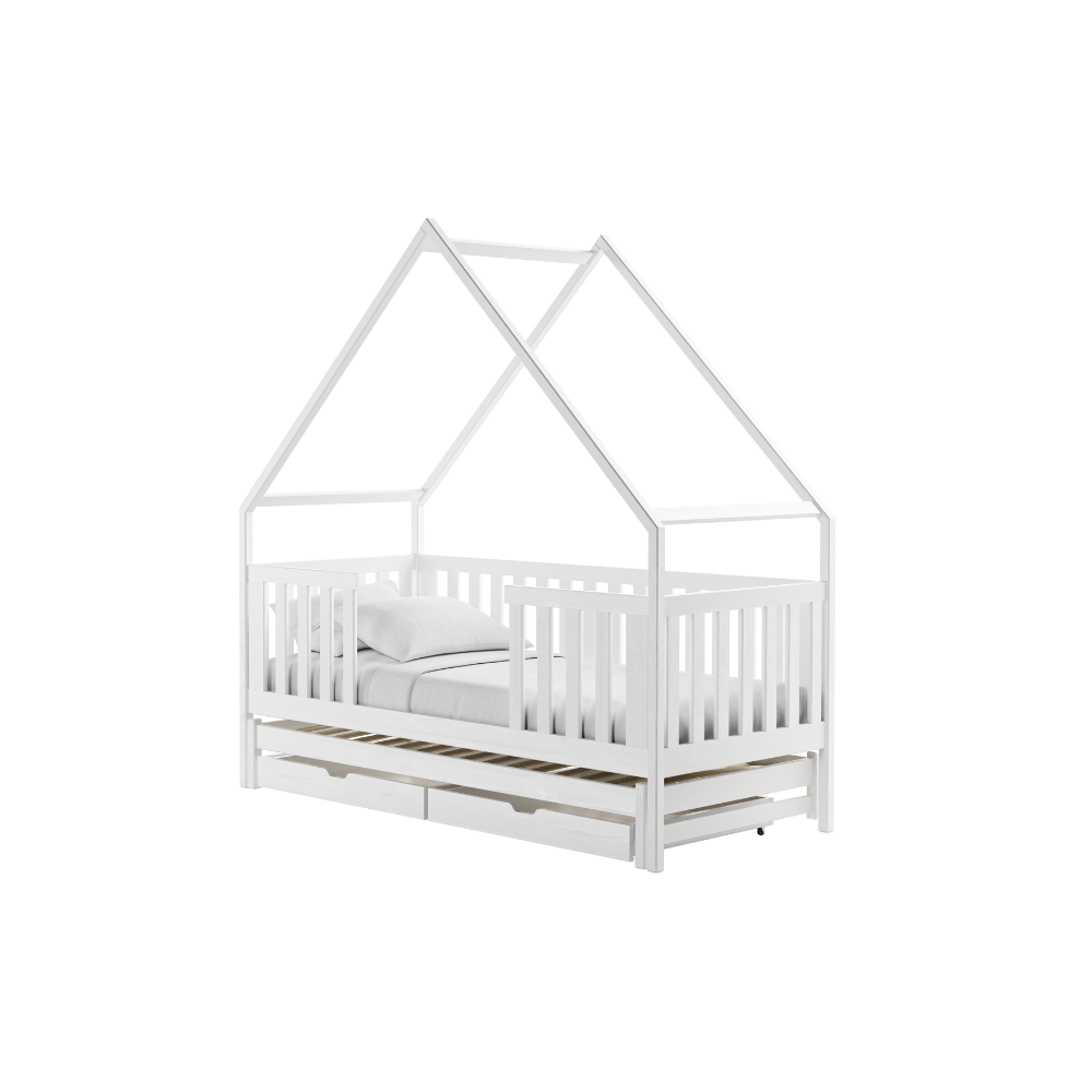 Das MAGIC Hausbett sieht auf den ersten Blick aus wie viele andere, aber seine Einzigartigkeit liegt im Detail. Das Etagenbett aus Kiefernholz ist mit einem ausziehbaren Teil ausgestattet, mit dem sich zwei separate Schlafbereiche schaffen lassen. Das Modell MAGIC Bett ist ein niedriges Etagenbett, daher ist es eine ideale Lösung für Kinder, die gerade lernen, alleine zu schlafen. Übermäßige Höhe löst oft Angst bei ihnen aus, daher ist es ratsam, sich für ein etwas niedrigeres Modell zu entscheiden, besonders am Anfang. Kieferholzbetten haben eine universelle Farbe und passen gut zu den anderen Elementen der Kinderzimmerausstattung. Das Kinderbett sieht schön in einem Raum aus, der in hellen Farben eingerichtet ist. Das MAGIC Bettmodell fügt sich in den skandinavischen Stil ein, was eine Antwort auf die Bedürfnisse von Eltern darstellt, die Einfachheit bevorzugen. Das MAGIC Hausbett mit ausziehbarem Teil ist eine praktische Lösung für Geschwister, insbesondere bei geringem Altersunterschied.